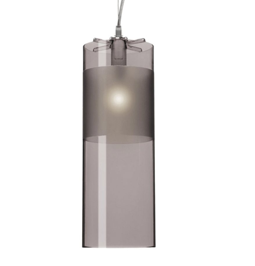 Lampada a sospensione di forma cilindrica, caratterizzata da un raffinato accostamento delle finiture del policarbonato, trasparente e sabbiato.