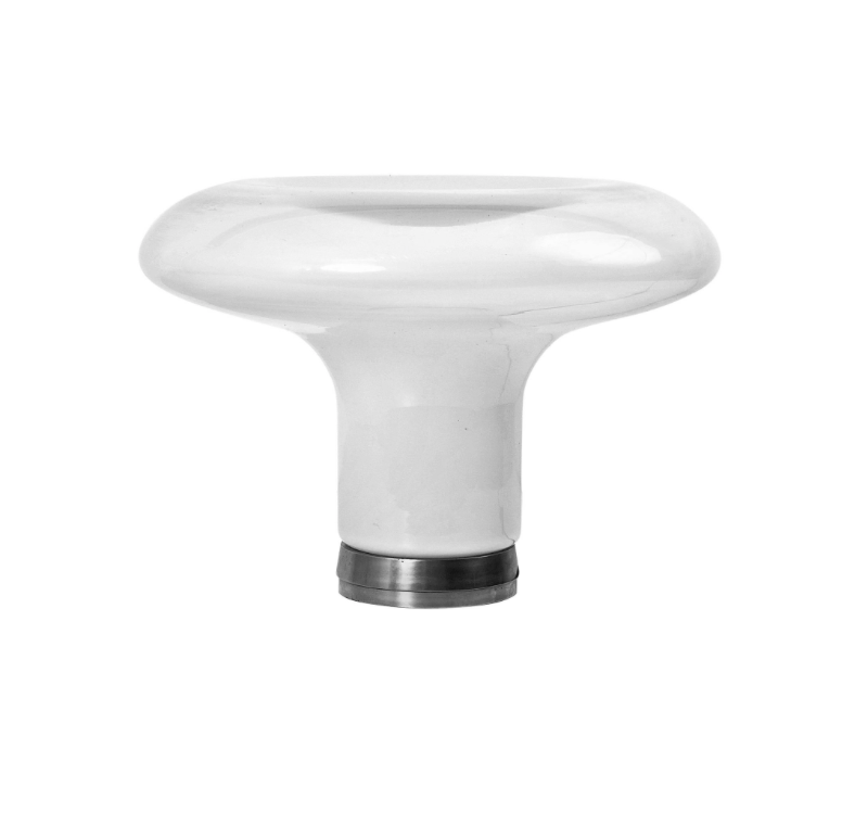 La lampada Lesbo di Angelo Mangiarotti (Italian, 1921–2012) – Artemide, ideata da Angelo Mangiarotti per Artemide nel 1966, rappresenta uno dei simboli del design italiano degli anni ‘70. Il progetto coniuga alcuni temi ricorrenti nell’opera del designer: l’uso sapiente del vetro e la scultorea forma a fungo. Si compone di una semplicissima base anulare in alluminio che sorregge il diffusore, realizzato in vetro di Murano soffiato a bocca per creare suggestive interazioni con la luce. La superficie bianca del diffusore presenta una gradazione opportunamente sfumata che permette di nascondere la sorgente luminosa e contribuisce ad indirizzare il fascio verso l’alto. L’effetto è perfetto per una lampada d’atmosfera, con l’emissione di una luce morbida che esalta le caratteristiche materiche del vetro. Trattasi di prodotto vintage, originale dell’epoca, appartenente ad una collezione privata. Lesbo si conserva in buone condizioni.