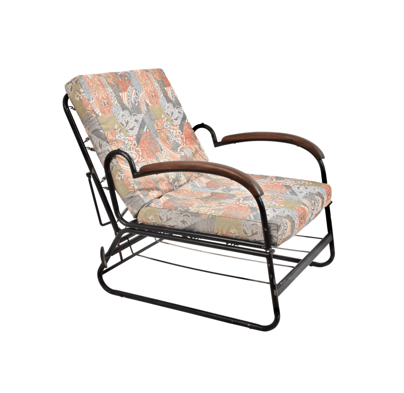 Poltrona da letto regolabile in metallo curvato con braccioli in legno. Può essere usato come una poltrona o un letto. Pubblicato in passato, Antiquariato e modernismo di Elisabetta Barborini Ferrari e Augusto Bulgarelli a p. 240.