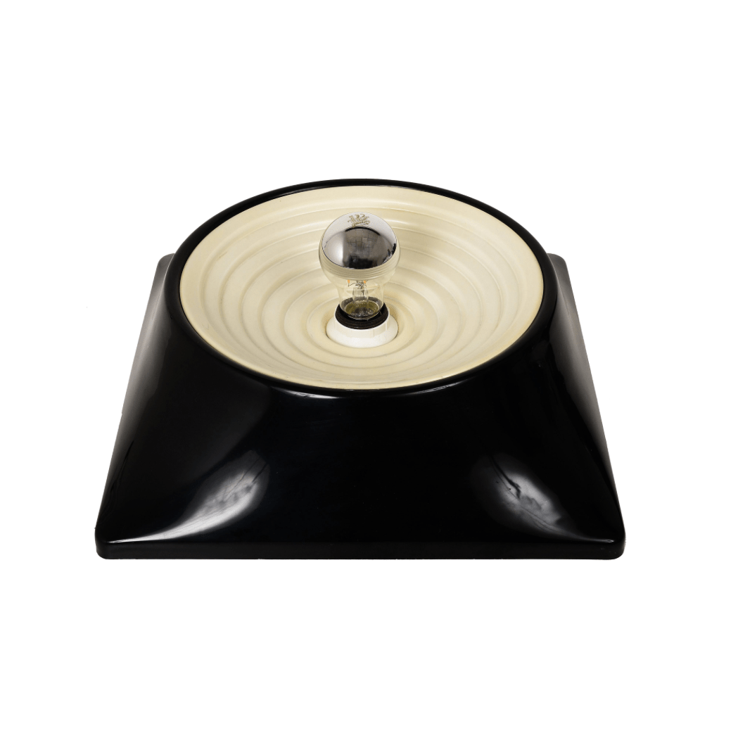 Plafoniera modello 1369 disegnata dallo Studio Nizzoli Associati per Stilnovo nel 1969. Supporto stampato in resina di colore nero. Disco riflettente in metallo smaltato bianco avorio. Marcatura a rilievo “Stilnovo Italia”. Condizioni estetiche Buone. Dimensioni cm. 36 x 36 profondità cm.11.