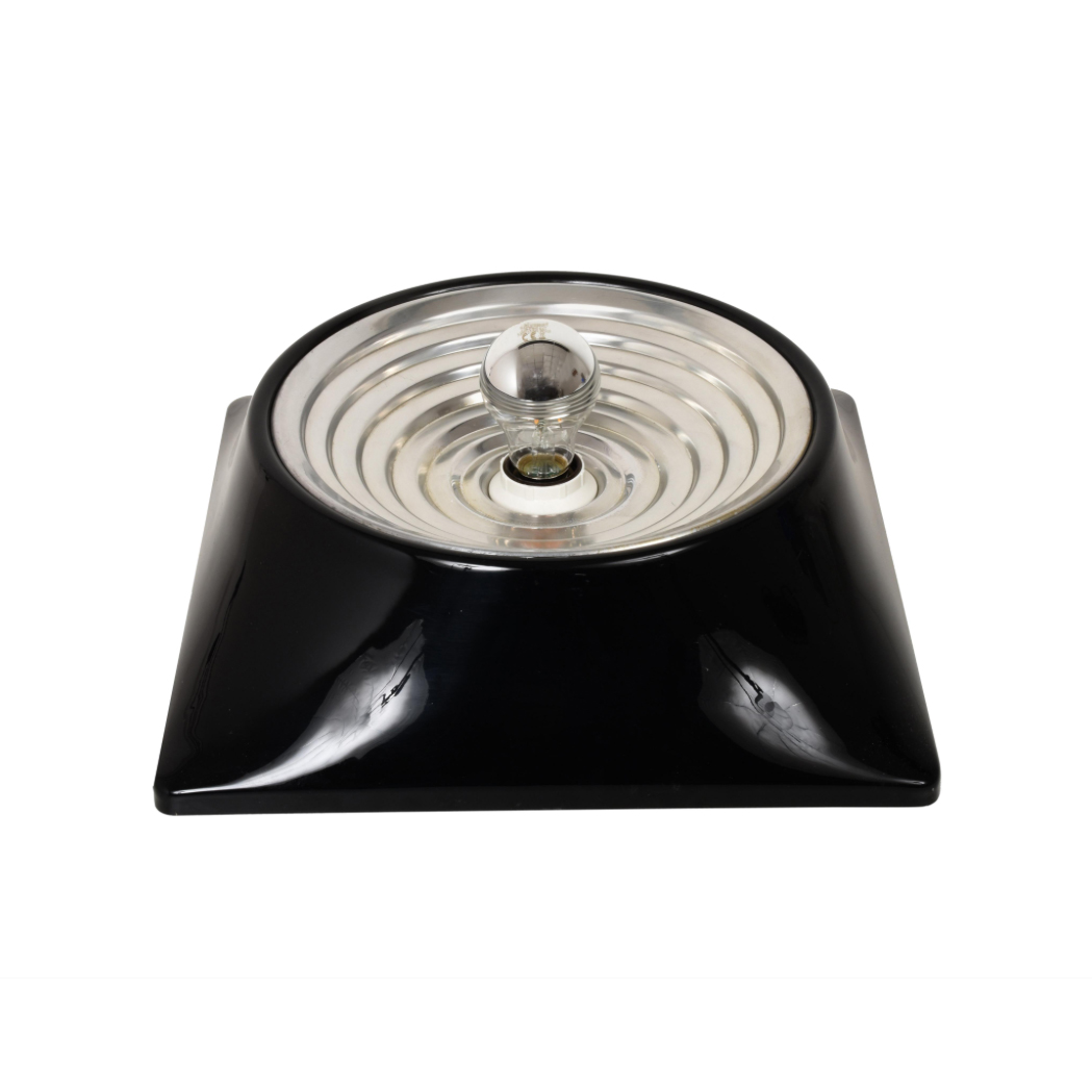 Plafoniera modello 1369 Progettata dallo Studio Nizzoli Associati per Stilnovo nel 1969. Supporto stampato in resina di colore nero. Disco riflettente in metallo cromato. Marcatura a rilievo “Stilnovo Italia”. Condizioni estetiche buone. Dimensioni cm. 36 x 36 profondità cm.11.