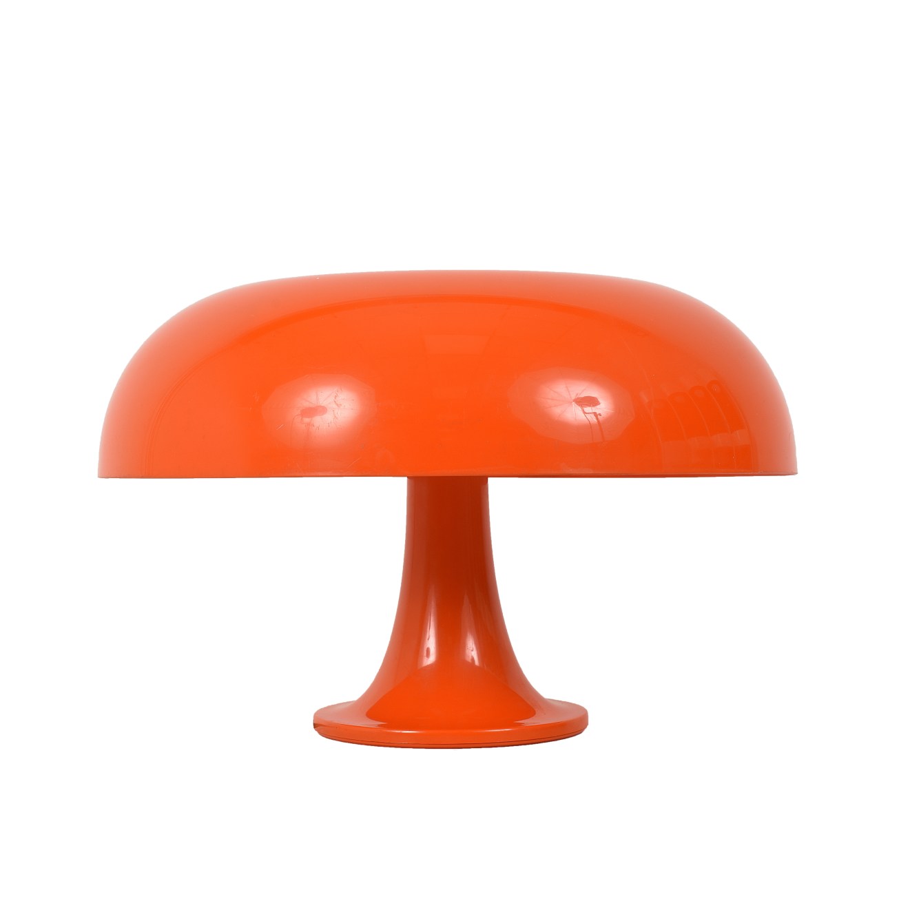 Primi esempi (fine anni ’60) Lampada da tavolo ‘Nesso’ disegnata da Giancarlo Mattioli e Urban Architects Group per Artemide. A differenza delle successive riemissioni di questa lampada iconica, questo esempio è stato realizzato utilizzando la tecnologia di stampaggio a iniezione termoplastica ABS. Forma a fungo composta da gambo svasato con quattro attacchi E / 14 e grande parte superiore “a ombrello”. Condizioni eccezionali Lampada da tavolo iconica in plastica stampata arancione disegnata da Giancarlo Mattioli, Gruppo Architetti Urbanisti “Città Nuova” per Artemide
