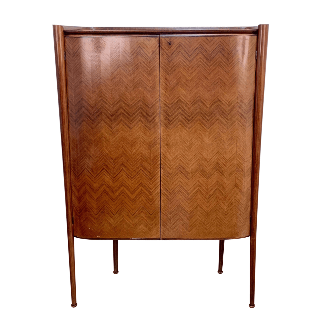 Eccezionale bar di Paolo Buffa, designer e architetto (1903-1970). Il corpo frontale leggermente ricurvo con i lati arrotondati e la balaustra è rialzato su lunghe gambe affusolate circolari che si estendono per l’intera lunghezza del pezzo. Le gambe che fanno parte dell’architettura piuttosto che degli allegati aggiungono supporto al caso. Le gambe sono coperte con alianti in ottone. Il mobile è impiallacciato con palissandro su tutti i lati e rifinito con lacca francese a base di gommalacca per il libero posizionamento. Le porte sono impiallacciate con un motivo a spina di pesce. Interno con interni illuminati e acero, che conserva le originali pareti a specchio, originali mensole in vetro e 9 cassetti piani, anch’essi originali. Serratura e anello in ottone sono originali con chiave. Riferimento: Roberto Rizzi “Cellulare Paolo Buffa”, Catalogo della mostra, Cantu, Italia. Le condizioni sono come foto.