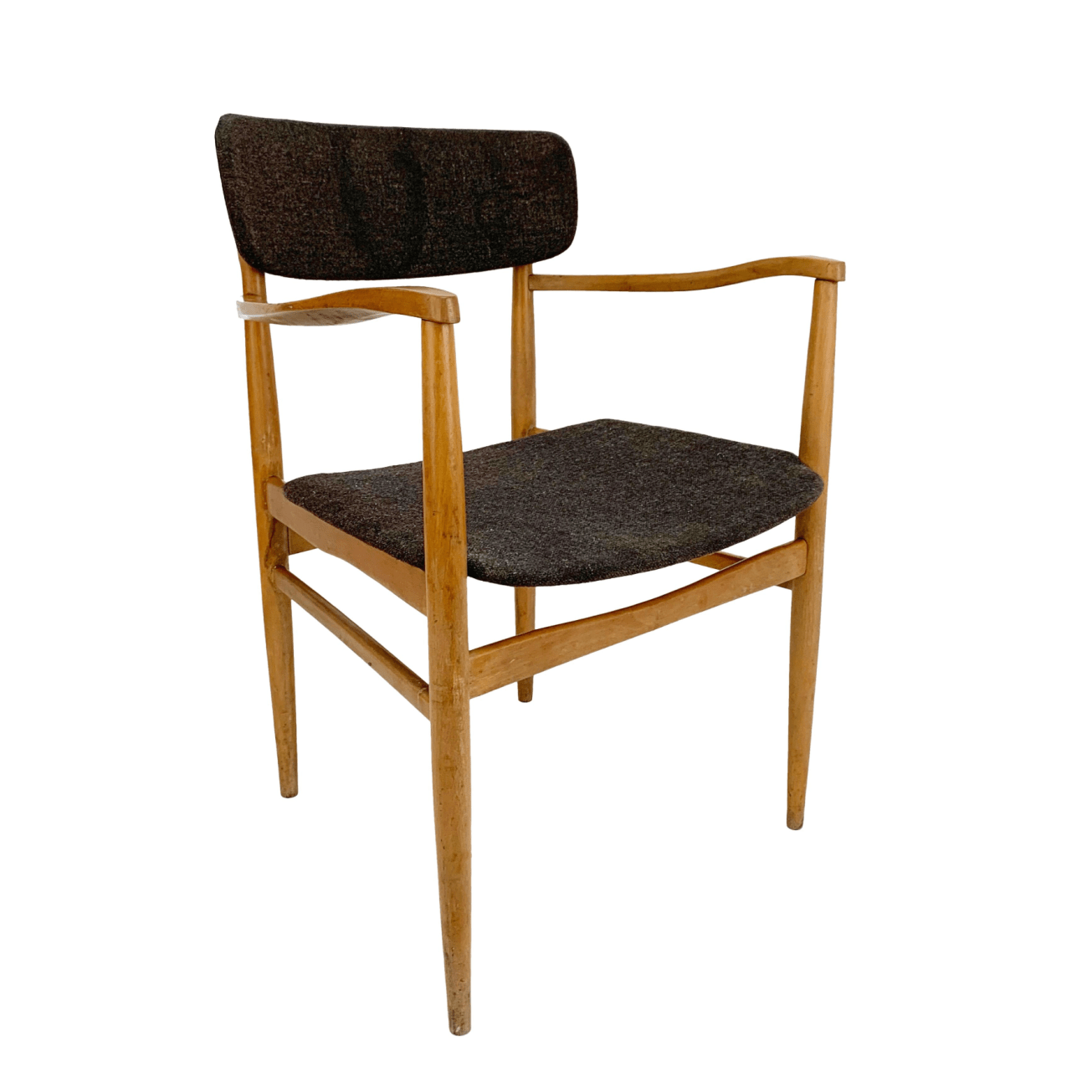 A comfortable chair with armrests and a beautifully curved back, in the style of Finn Juhl. The chair is made of light wood with fabric covering. The chair is in good vintage condition and would be perfect to use in combination with a desk.
