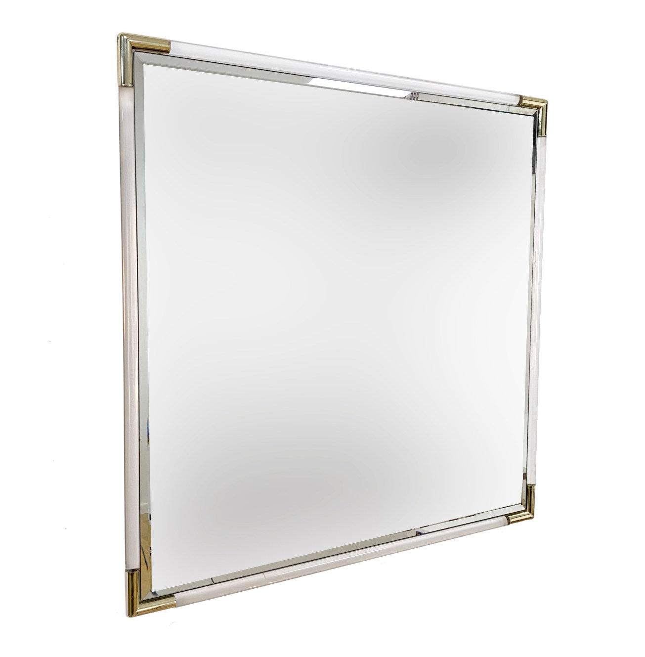 Elegante specchio da parete, finemente intagliato, con cornice Lucite, angoli in metallo dorato. Firmato. Forma quadrata Italia, anni ’70.