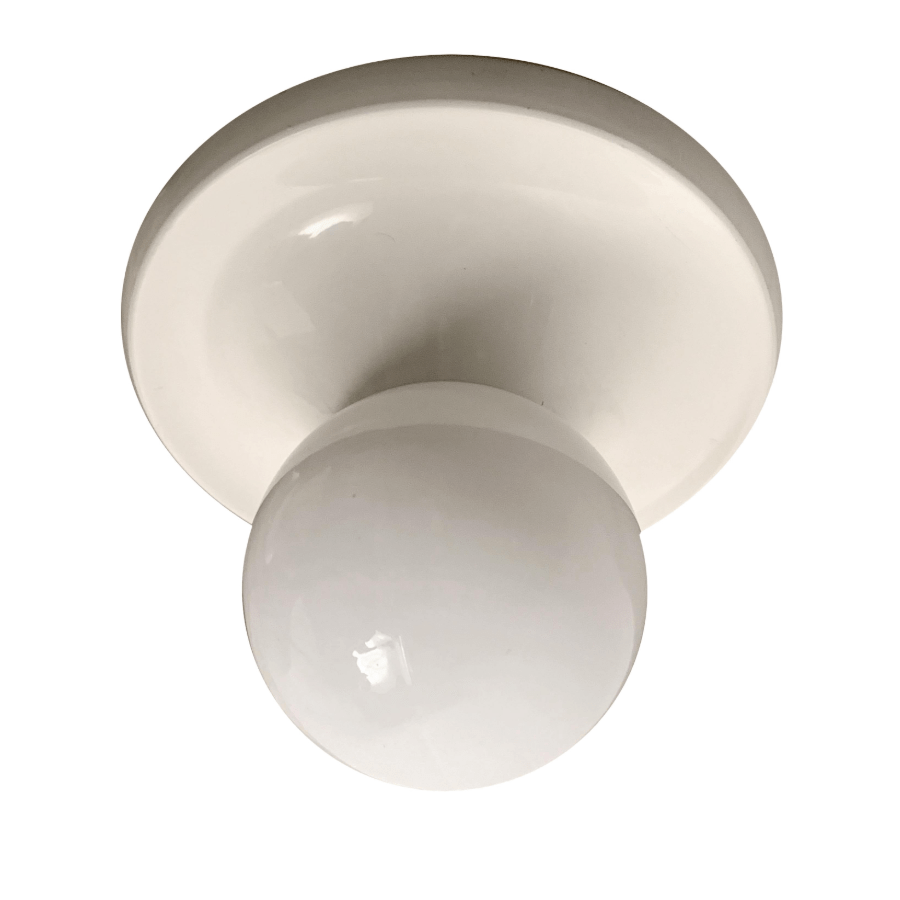 Plafoniera di Achille Castiglioni. Progettato e prodotto in Italia per Flos, circa anni ’60. Metallo smaltato e vetro opalino. Ogni luce prende una lampadina E27 75w massimo. Letteratura: Casa Amica, 27 giugno 1972, p. 105 ottagon 30 settembre 1973, p. 149 Sergio Polano, Achille Castiglioni tutte le opere, Electa, Milano, 2001, p. 224 Giuliana Gramigna, repertorio 1950-2000, Allemandi, Torino, 2003, p. 121.