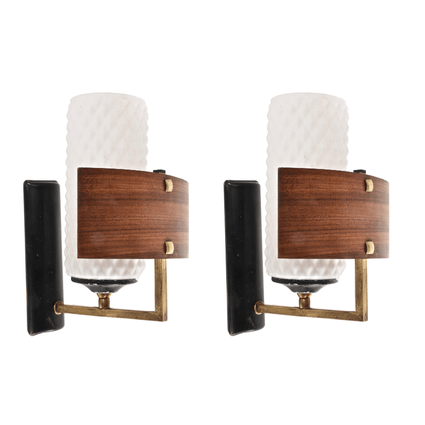 Coppia di appliques di Studio Reggiani, Italia, 1950. Queste lampade da parete hanno un braccio in ottone, con supporti in alluminio laccato nero. Due paralumi in vetro opalino e diffusori in compensato di teak. Illuminazione tipica italiana in condizioni eccellenti. Fornisce una luce sferica molto bella quando è accesa.