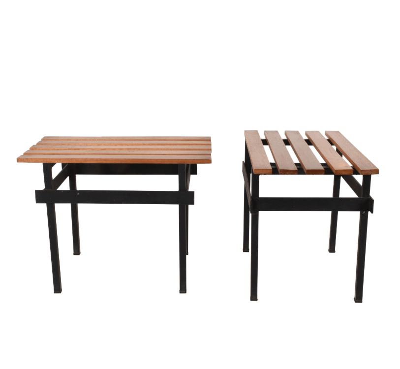 Set di due panche in legno di teak. La solida base in ferro smaltato. Eccellenti oggetti di design degli anni ’60.