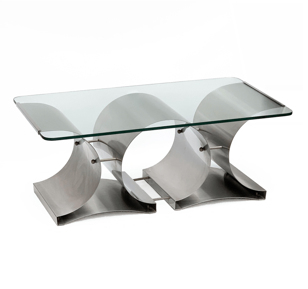 Questo tavolo di alta qualità è realizzato in acciaio inossidabile spazzolato, il piano in vetro trasparente lascia intravedere la bellezza della struttura. Nelle migliori condizioni originali. Il tavolo mostra un design chiaro e futuristico.