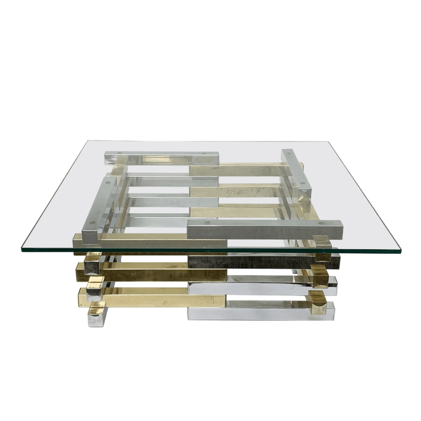 Tavolino con piano in vetro quadrato, in ottone e cromato. Di Pierre Cardin. Francia, circa 1970.