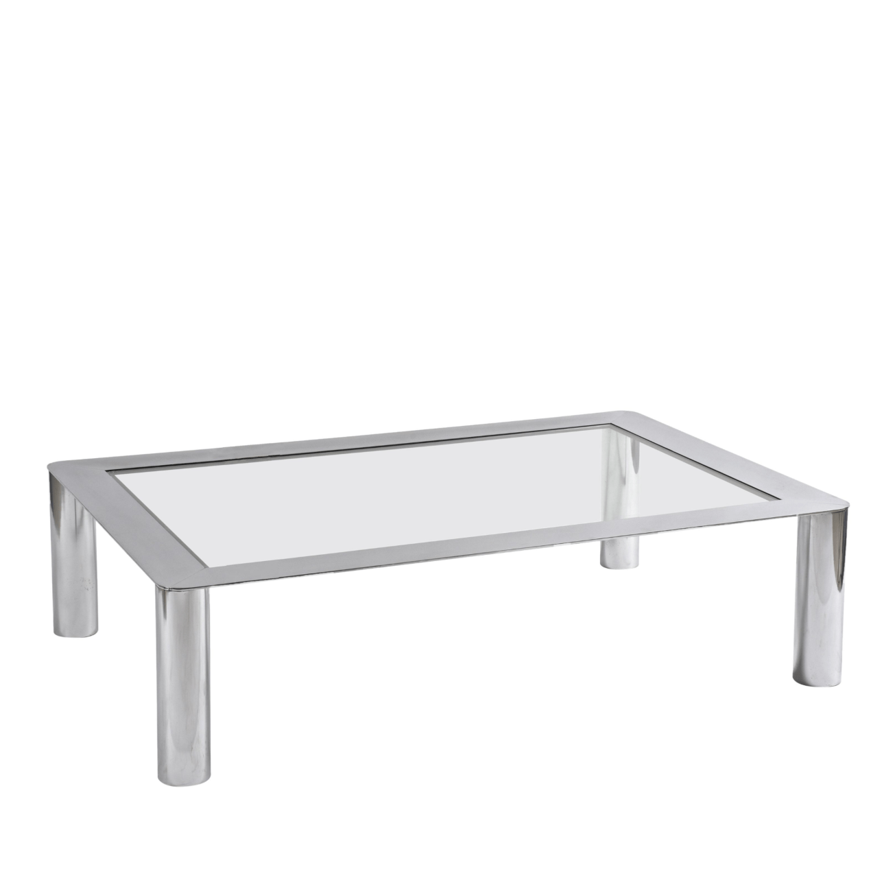 Un tavolo basso in acciaio con gambe cilindriche e un sottile grembiule cromato con vetro incassato. Progettato da Sergio Mazza e Giuliana Gramigna per Cinova, uno dei principali produttori italiani di mobili di design. Il tavolo è in buone condizioni originali con qualche graffio (vedi foto) Pubblicazioni: Giuliana Gramigna, Direttorio 1950/1980. Immagini e contributi per una storia del mobile italiano, Arnoldo Mondadori, Milano 1985, p. 295