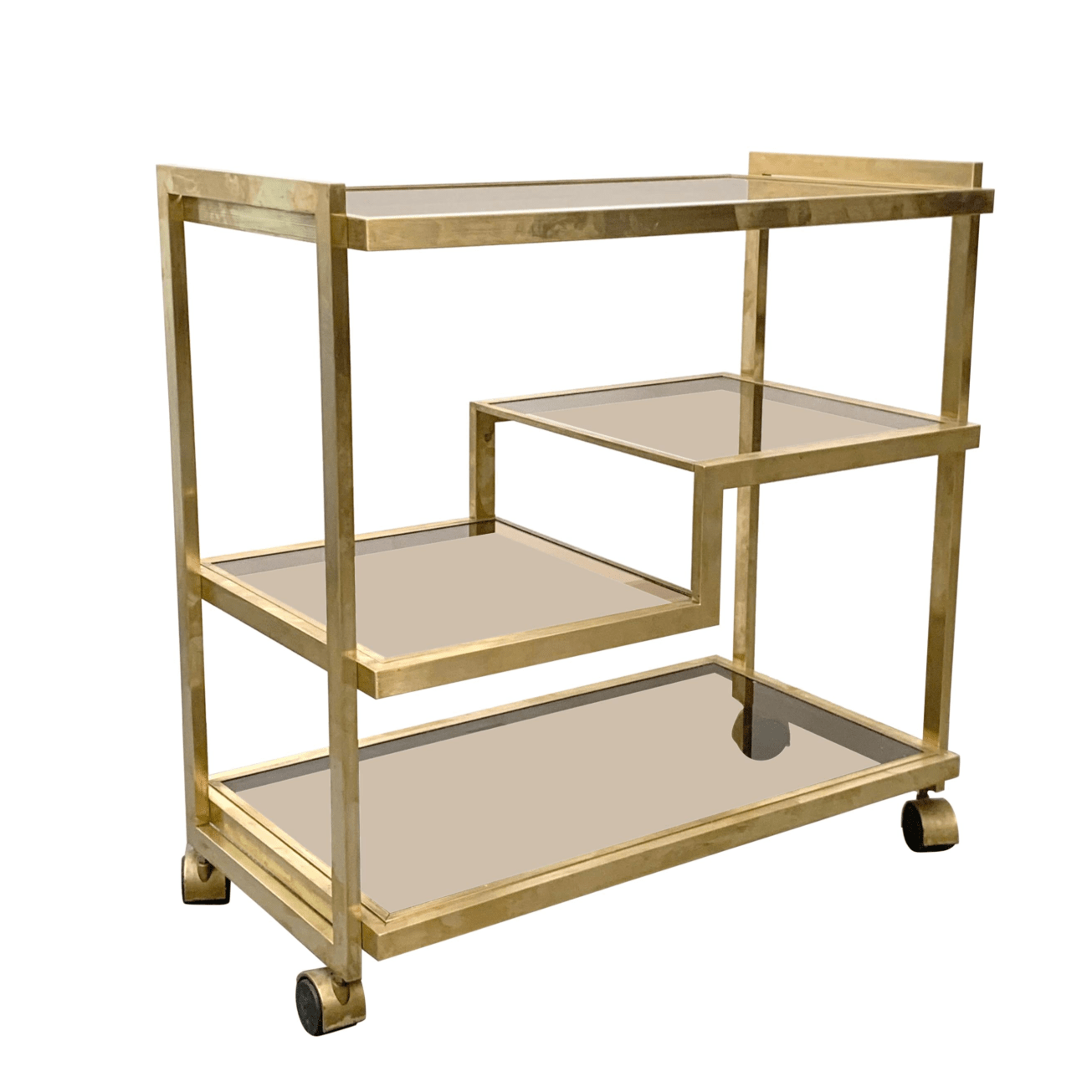 Eccezionale carrello di servizio a quattro livelli prodotto da un produttore italiano negli anni ’70. Questo fantastico carrello da bar è realizzato in ottone dorato e bicchieri fumé, con un gioco unico di quattro livelli e uno regolabile. Questo incredibile pezzo, attribuito a Romeo Rega, diventerà il punto focale di un bar o di un salotto di metà del secolo.