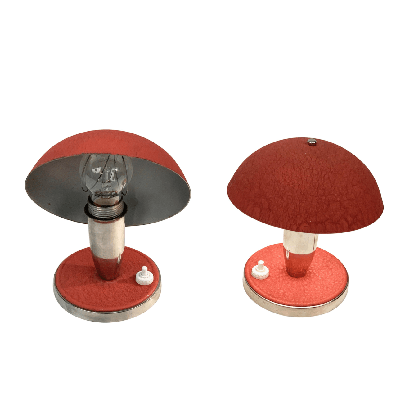 Splendida coppia di lampade da tavolo rosse Bauhaus prodotte negli anni ’30 nella Repubblica Ceca. Sono sia funzionali che decorative, con il loro paralume in metallo regolabile e con il loro sistema di cablaggio originale. Montano una grande lampadina E27. Una lampada ha un filo elettrico rosso e l’altra bianca, rendendo questo pezzo unico e perfetto per una camera da letto