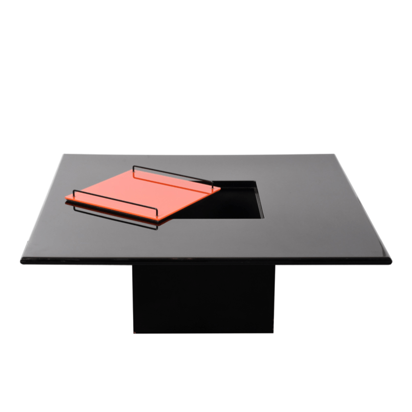 Splendido tavolino quadrato con foro centrale quadrato per vano bar. È attribuito al maestro del design Willy Rizzo ed è stato prodotto in Italia negli anni ’70. Realizzato in legno laccato nero con una parte centrale in vetro arancione, che può essere inserito in un vassoio con manici in metallo. Questo tavolo è semplicemente un capolavoro, che sarà il punto focale di un salotto o una cucina di metà del secolo. Misure (cm): Larghezza 110 Profondità 110 Altezza 42.