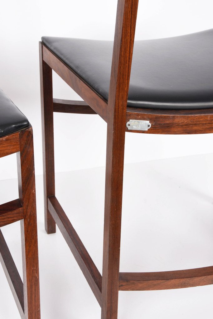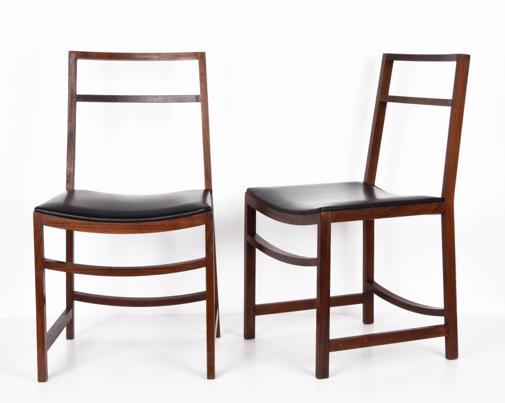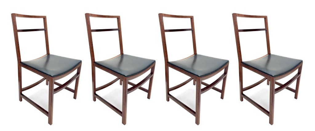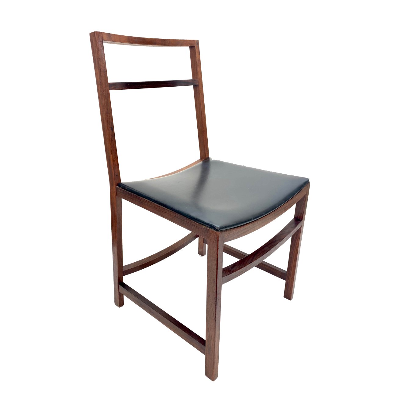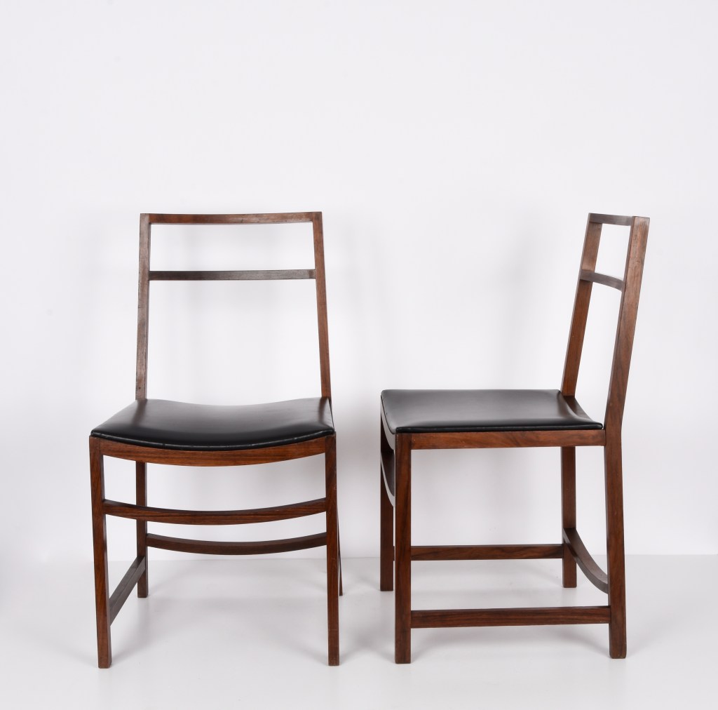 Incredibile set di 4 sedie Mid-Century in palissandro e ecopelle. Questo fantastico set è stato progettato da Renato Venturi per MIM in Italia negli anni ’60. Questo fantastico set è composto da sedie in legno di palissandro massello e leggero e meravigliosamente ecopelle nera. Il set viene fornito con l’etichetta originale MIM Roma e numerato 291 e sono in condizioni vintage sorprendenti. Un set che sarà perfetto per abbellire un soggiorno o una sala da pranzo della metà del secolo.