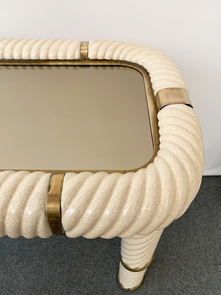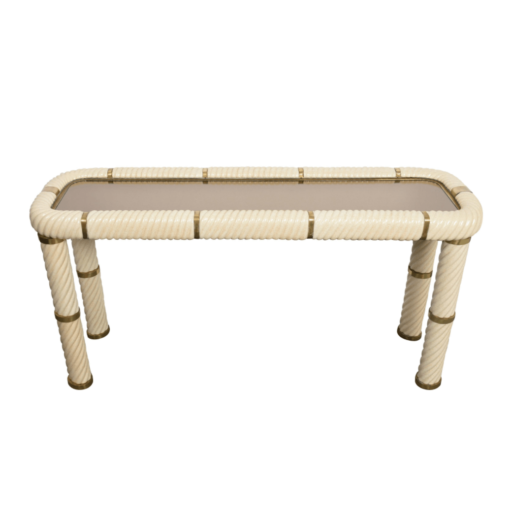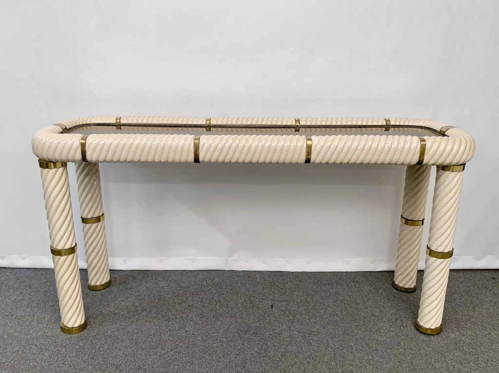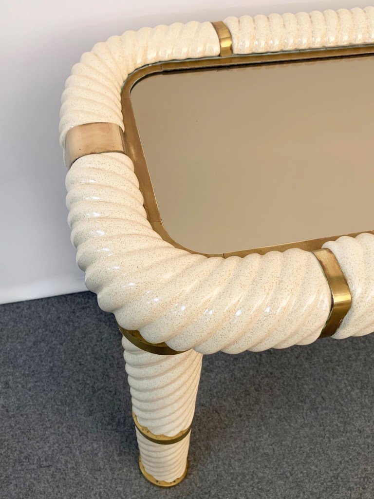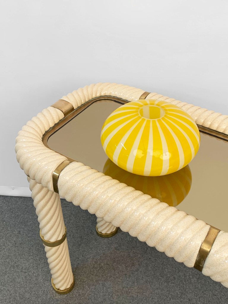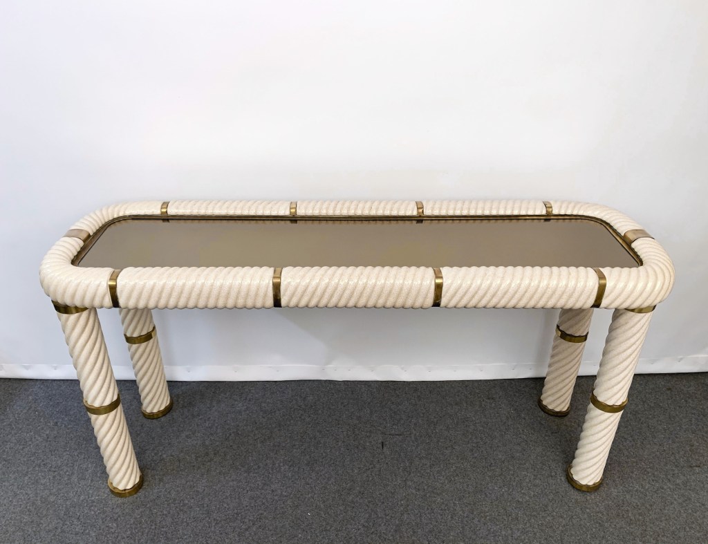 Incredibile consolle in ceramica stile Hollywood Regency della metà del secolo in ottone e vetro a specchio. Questo meraviglioso oggetto è stato disegnato in Italia negli anni ’70 e disegnato da Tommaso Barbi. Questo straordinario pezzo presenta gambe a colonna in ceramica porcellana a forma di spirale e un piano in vetro bronzato a specchio con finiture in ottone massiccio. Un meraviglioso tavolo della metà del secolo con etichetta originale. Un pezzo sorprendente che gioca con le luci e il riflesso, contribuirà a un carattere lussuoso degli interni. La combinazione di porcellana e ottone crea uno splendido colpo d’occhio, perfetto per un soggiorno in stile metà del secolo.