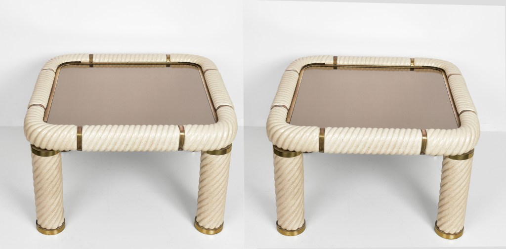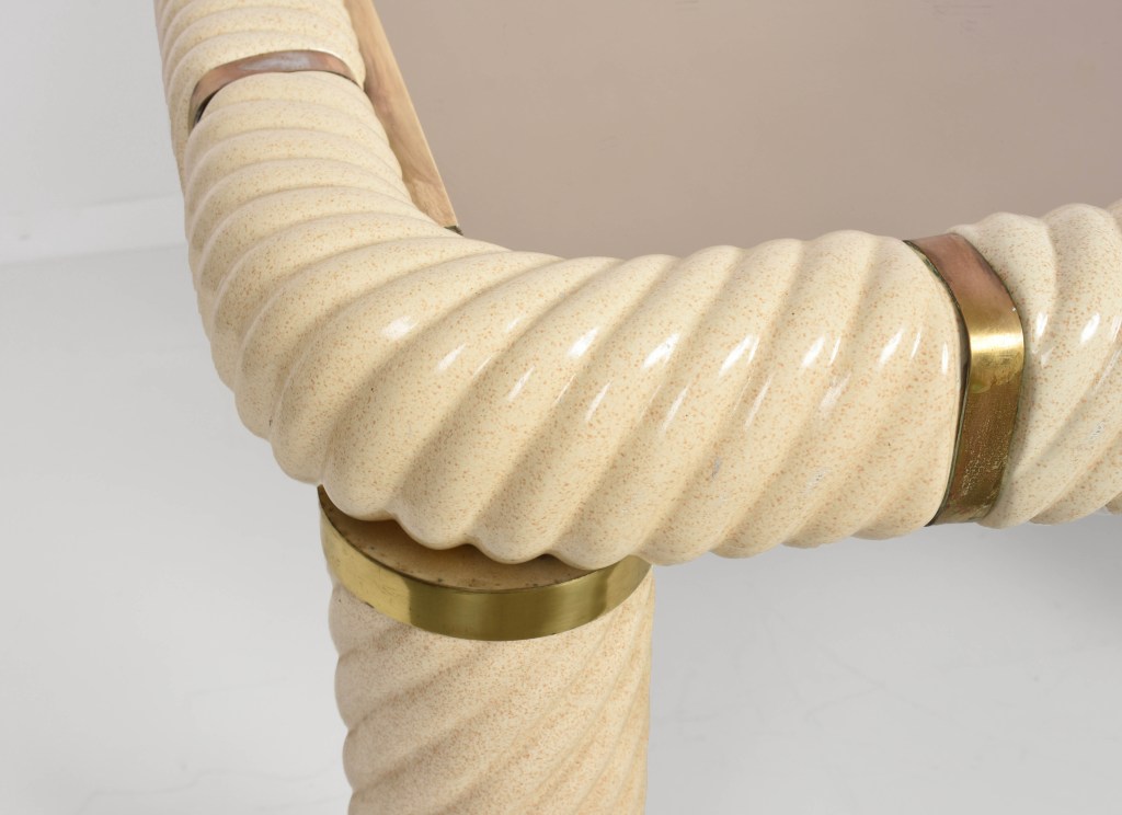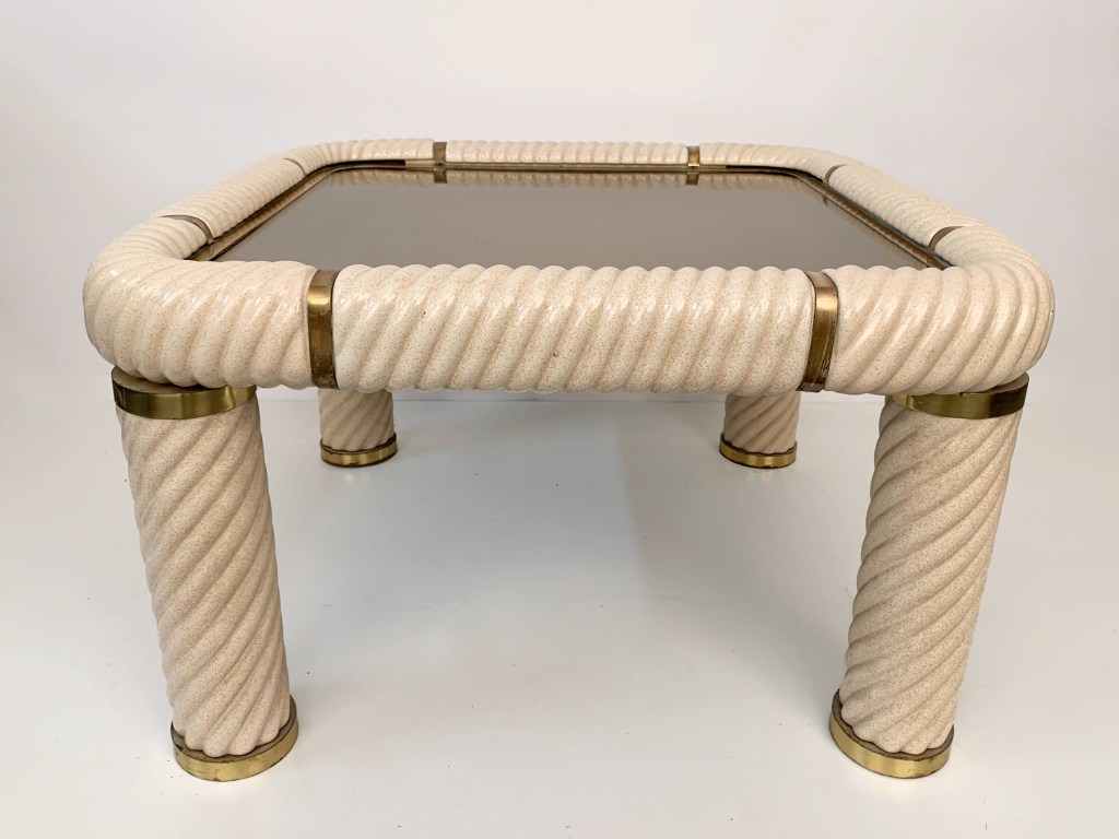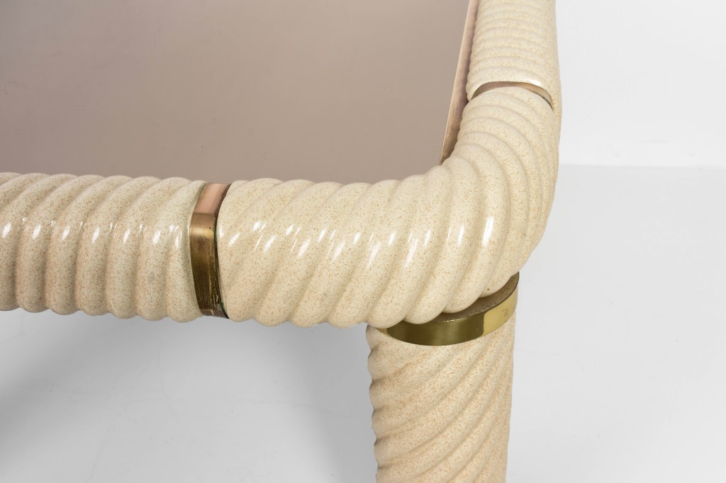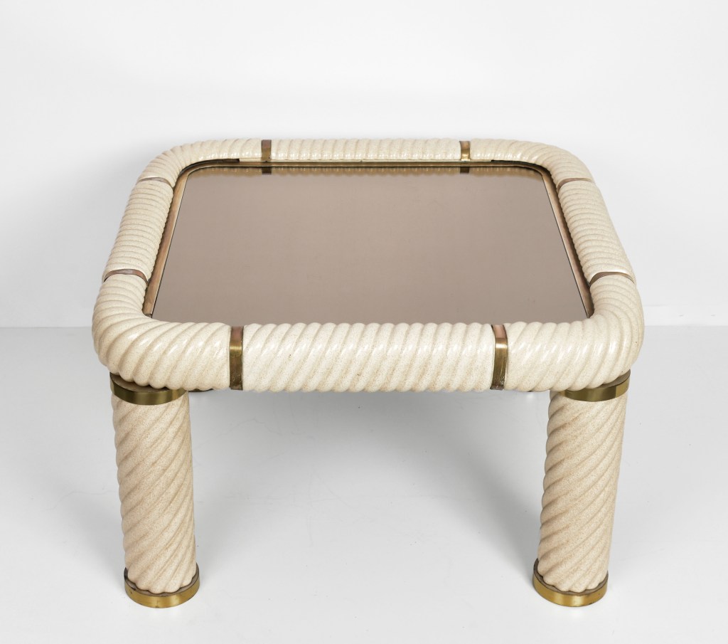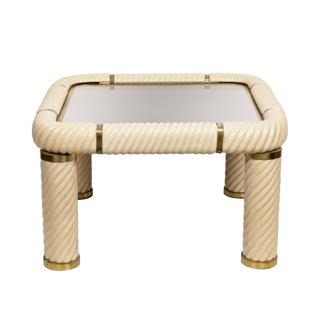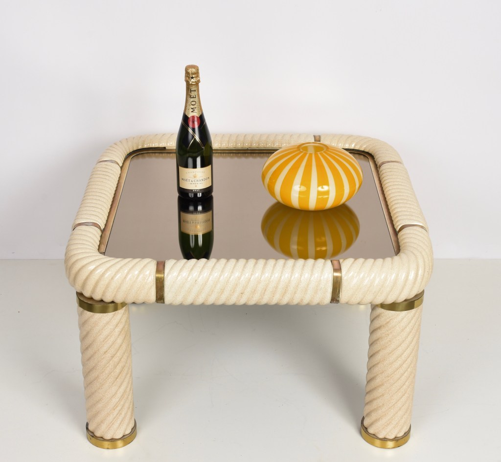 Tavolo da cocktail quadrato in ottone e vetro specchiato in ceramica stile Hollywood Regency della metà del secolo. Questo meraviglioso oggetto è stato disegnato in Italia negli anni ’70 e disegnato da Tommaso Barbi. Questo straordinario pezzo presenta gambe a colonna in ceramica porcellana a forma di spirale e un piano in vetro bronzato a specchio con finiture in ottone massiccio. Un meraviglioso tavolo della metà del secolo con etichetta originale. Un pezzo sorprendente che gioca con le luci e il riflesso, contribuirà a un carattere lussuoso degli interni. La combinazione di porcellana e ottone crea uno splendido colpo d’occhio, perfetto per un soggiorno in stile metà del secolo.