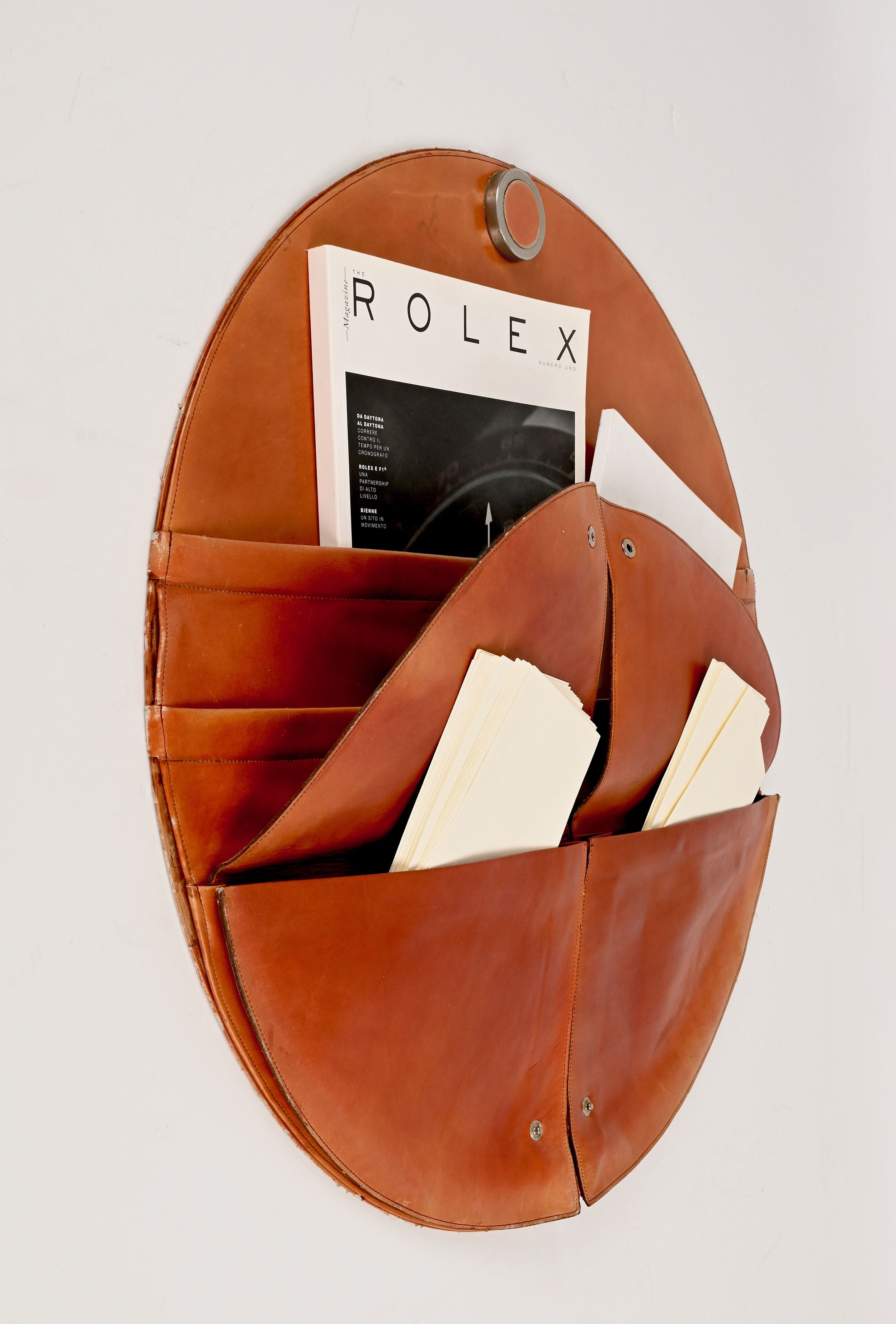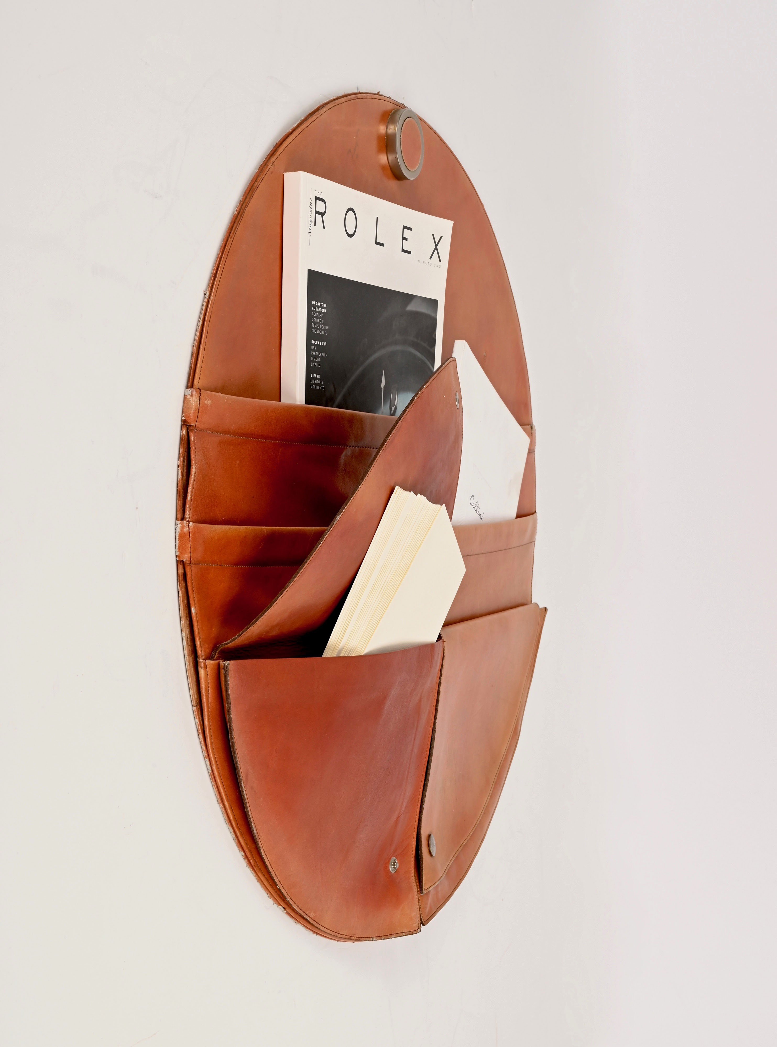 Incredibile portariviste da parete tondo in pelle e acciaio della metà del secolo. Questo pezzo sorprendente è stato prodotto da Frau in Italia negli anni ’70.
