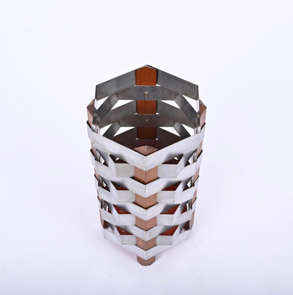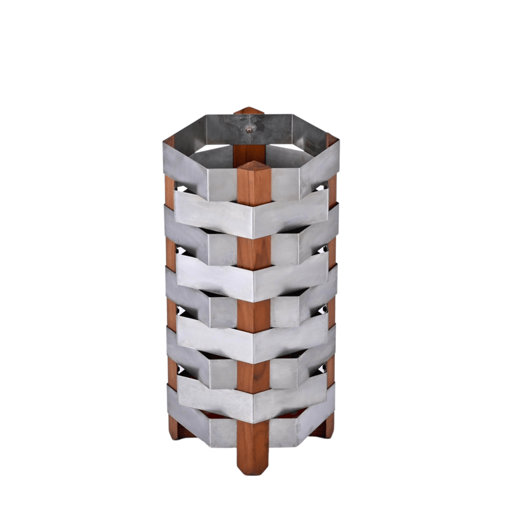 Questo incredibile pezzo è composto da quattro supporti triangolari in legno massello di teak che tengono insieme un elegante intreccio di strisce di acciaio inossidabile piegate in forme esagonali. Le bande metalliche si agganciano ai supporti in legno a intervalli alternati, creando lo straordinario design della trama.