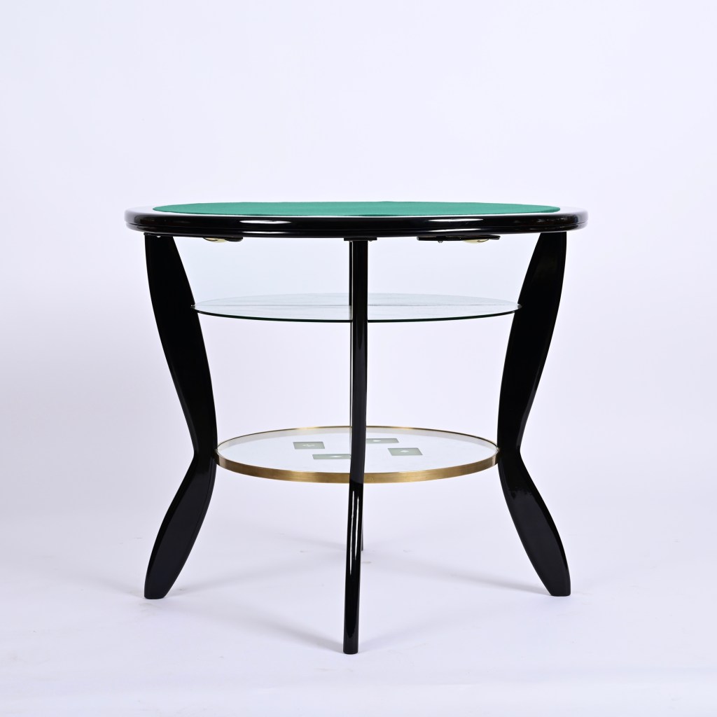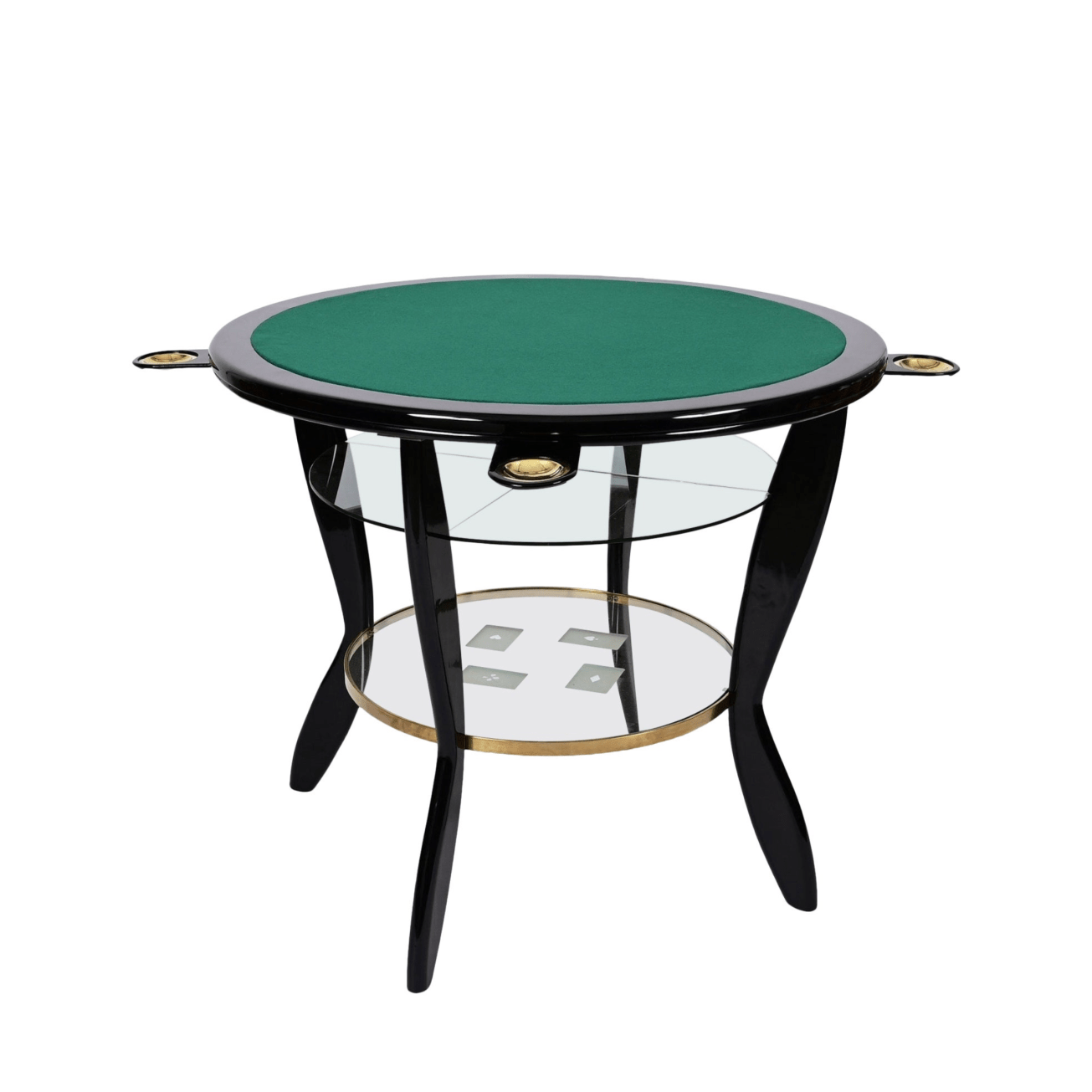 Incredibile tavolo da gioco rotondo della metà del secolo in faggio ebanizzato e ottone con due ripiani in vetro.