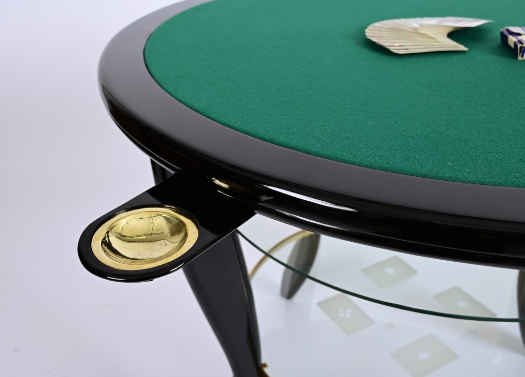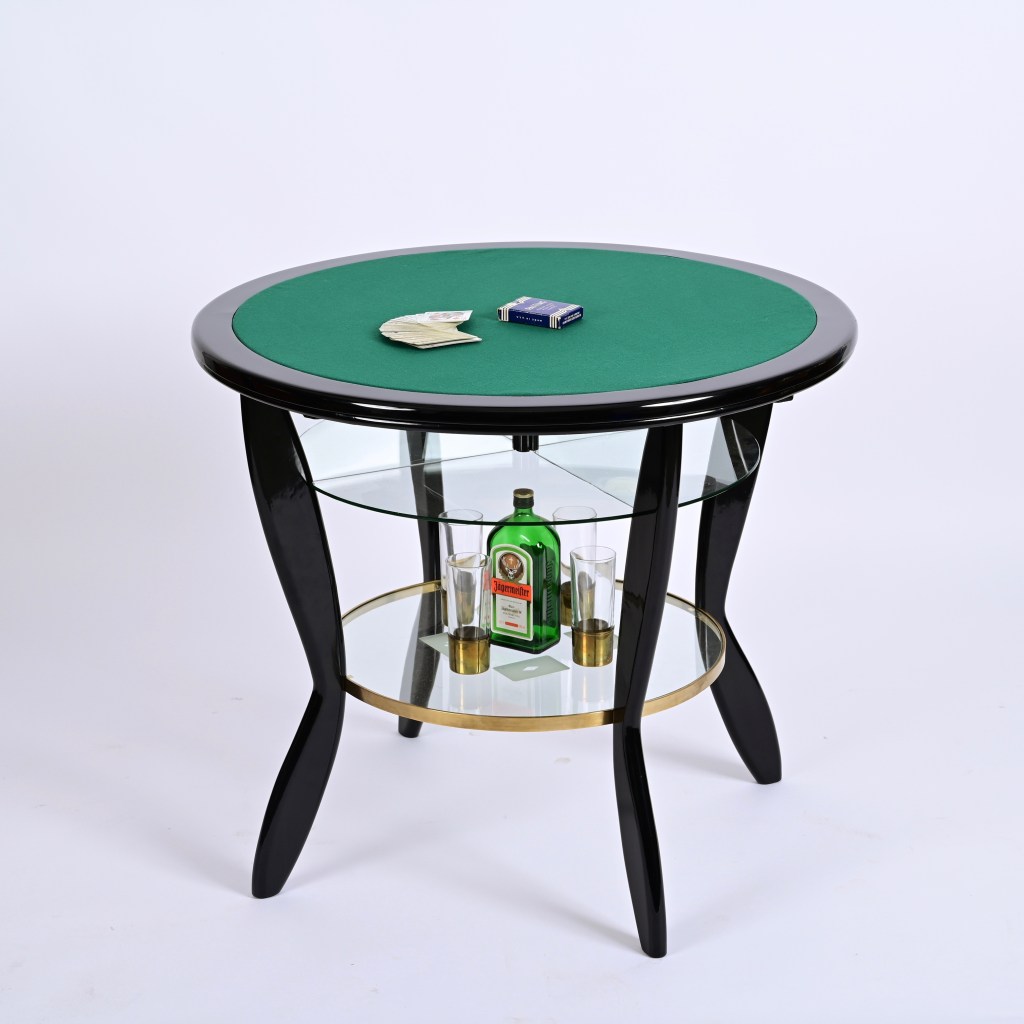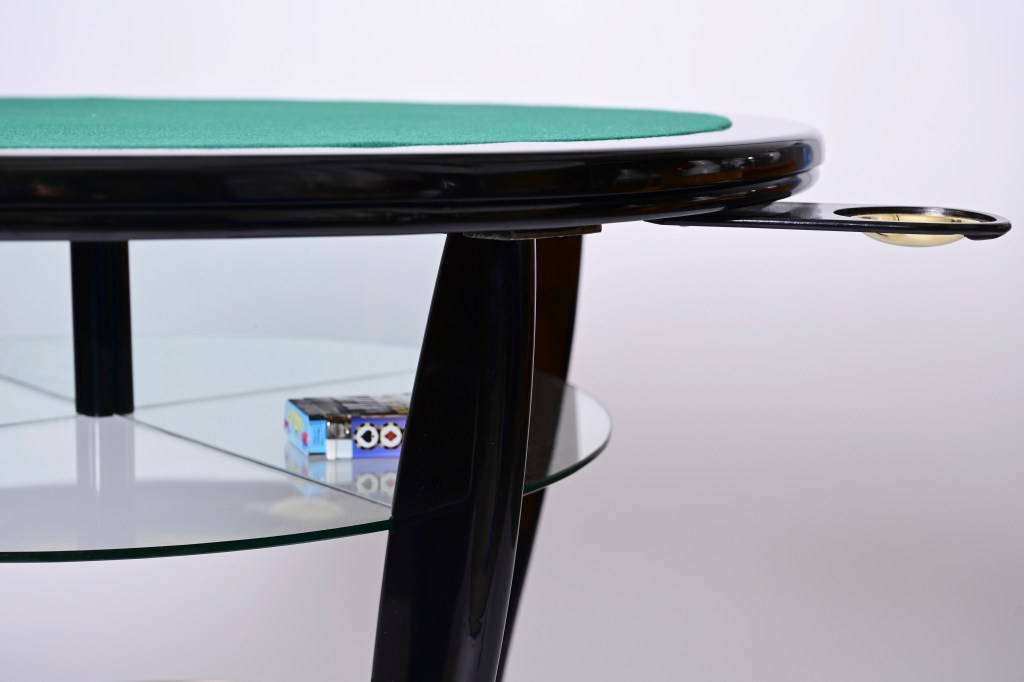 Questo pezzo è attribuito a Gio ed è stato prodotto in Italia negli anni ’50. Questo pezzo è un autentico capolavoro: un faggio ebanizzato mozzafiato, quattro posacenere in ottone a scomparsa, quattro divisori e quattro aree separate, ognuna uguale a una fetta del tavolo. Il ripiano inferiore è in vetro inciso e rappresenta le carte, e poggia su un anello in ottone massiccio. Il pezzo è stato restaurato attraverso rifiniture e rivestimenti professionali. Un oggetto evergreen che diventerà il punto focale di un soggiorno o di uno studio.