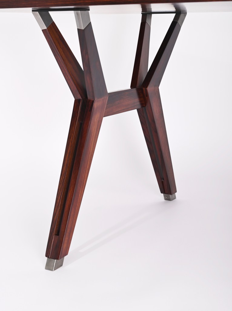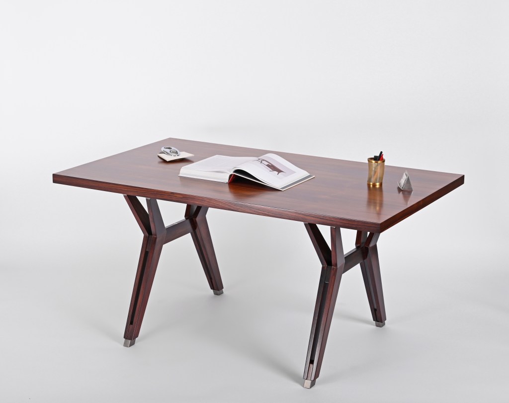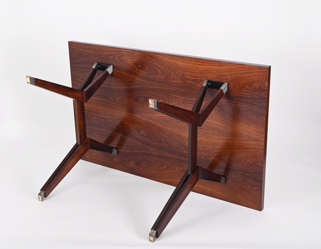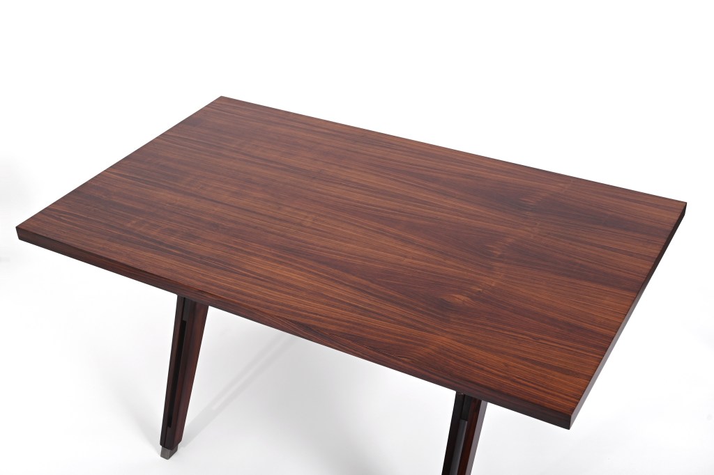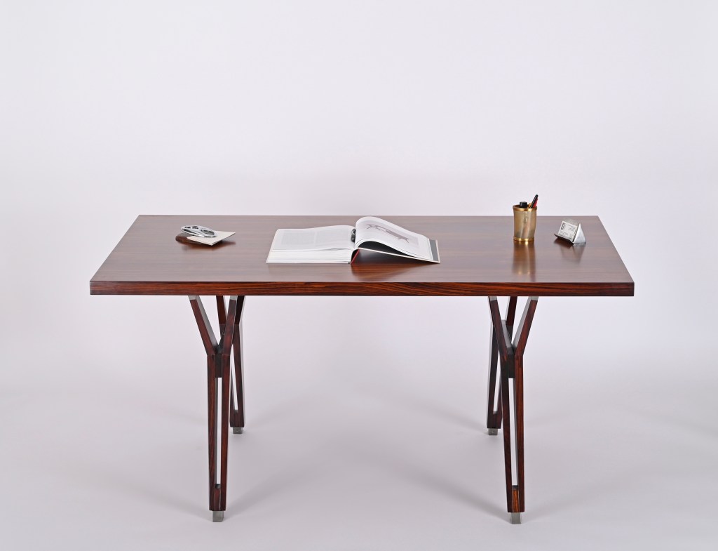Stupenda scrivania “Terni” disegnata da Ico Parisi e prodotta da MIM Roma nel 1958. La scrivania è composta da un piano rettangolare a spigoli vivi in palissandro Santos con meravigliose venature del legno e un unico cassetto posizionato al centro che può anche essere rimosso. Le gambe simmetriche conferiscono alla scrivania un design incredibilmente pulito ma robusto e poggiano su piedini metallici autolivellanti.