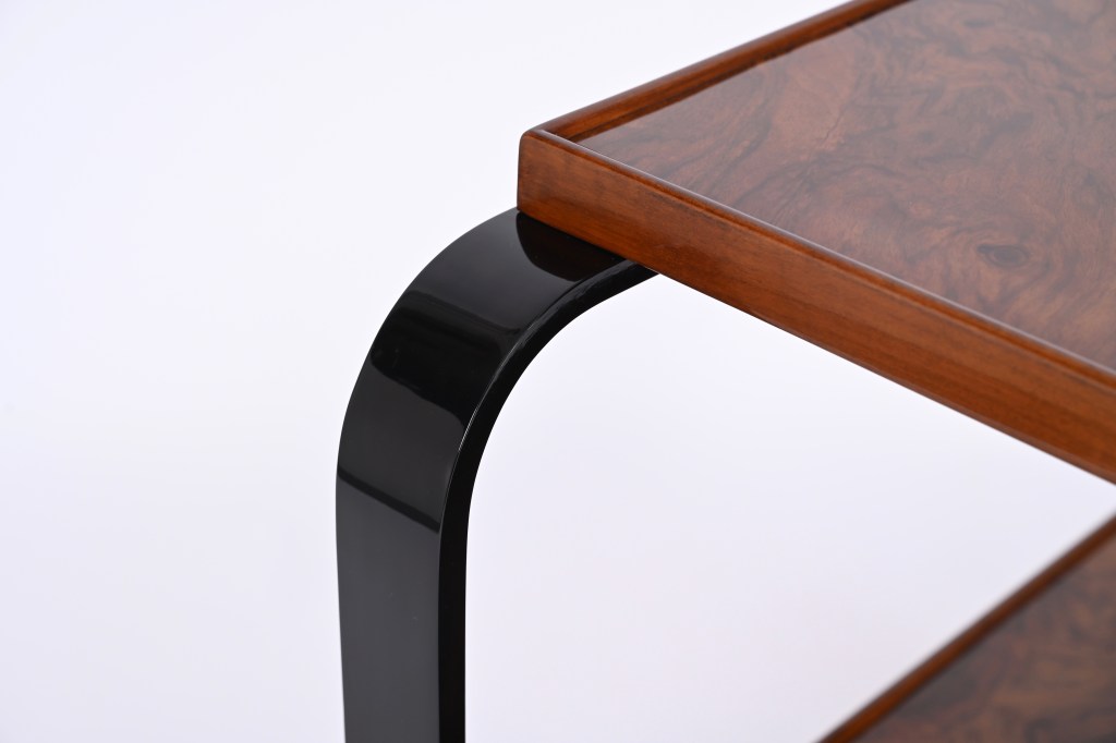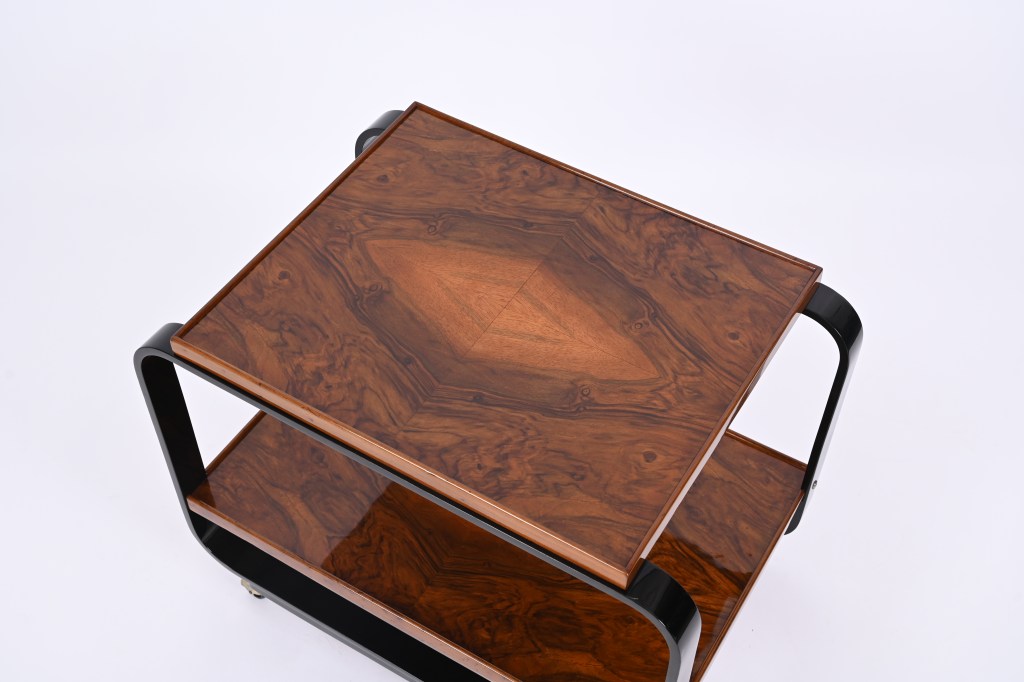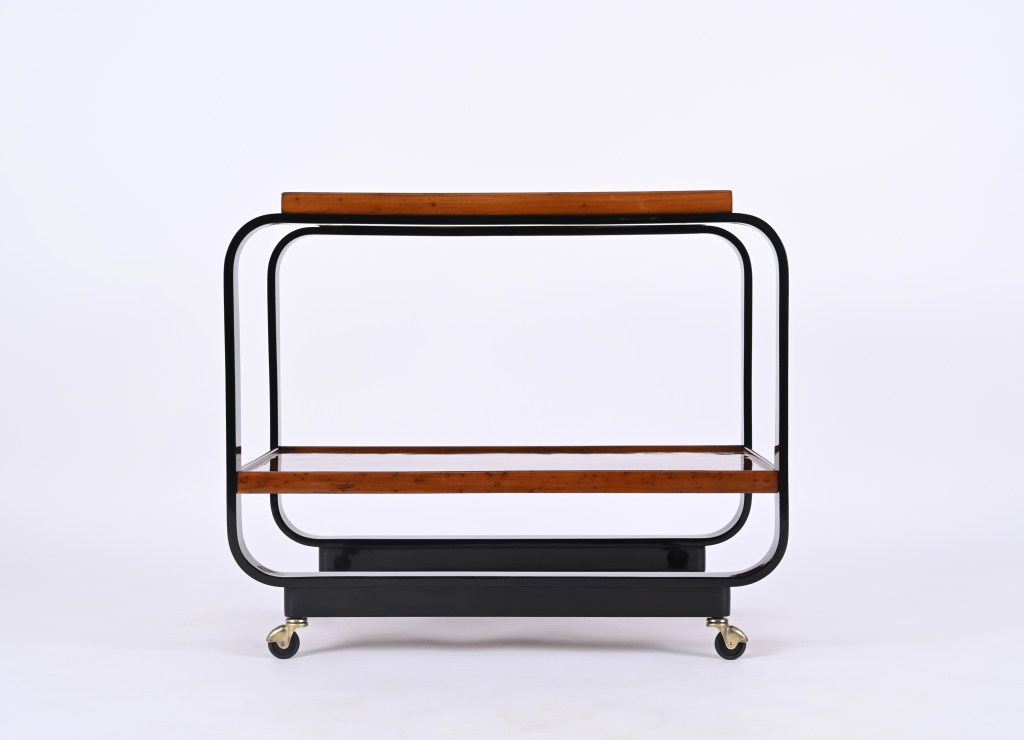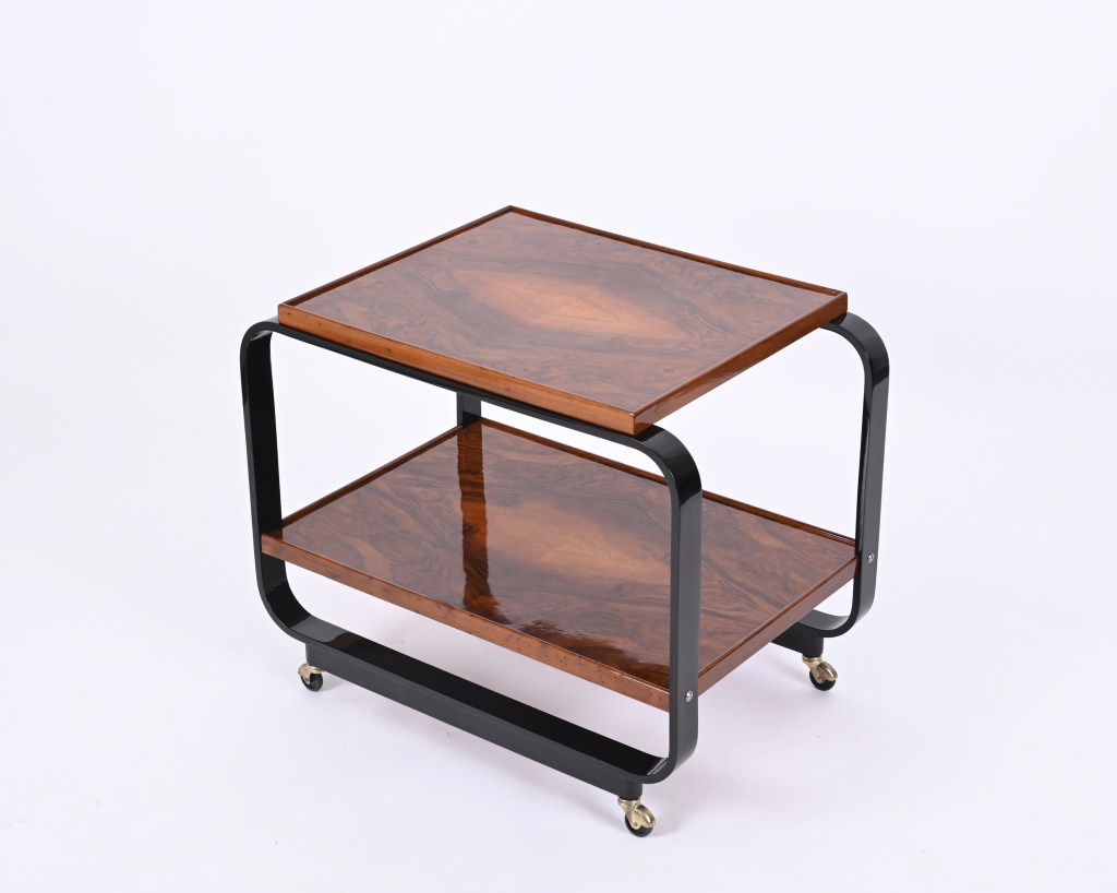 Questo raro tavolo da servizio presenta una struttura in legno curvato laccato nero e due ripiani in uno splendido legno di noce fiammato che sembra quasi radica. La particolarità del carrello sta nella tecnica di curvatura del legno che fu brevettata dall’architetto Gino Maggioni con un nuovo metodo che prevedeva la curvatura a freddo del legno invece della classica immersione in acqua calda.