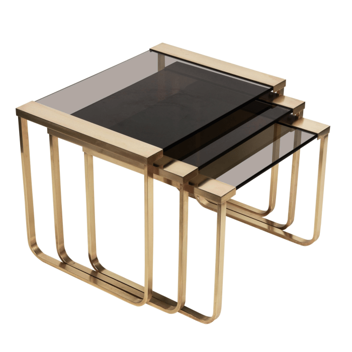 Tavolini ad incastro Mid-Century in ottone massiccio e vetro fumé, Francia anni ’70