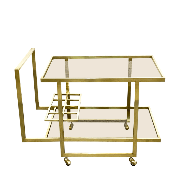 Carrello da bar Mid-Century a due livelli in vetro fumé e ottone con portabottiglie, anni ’70