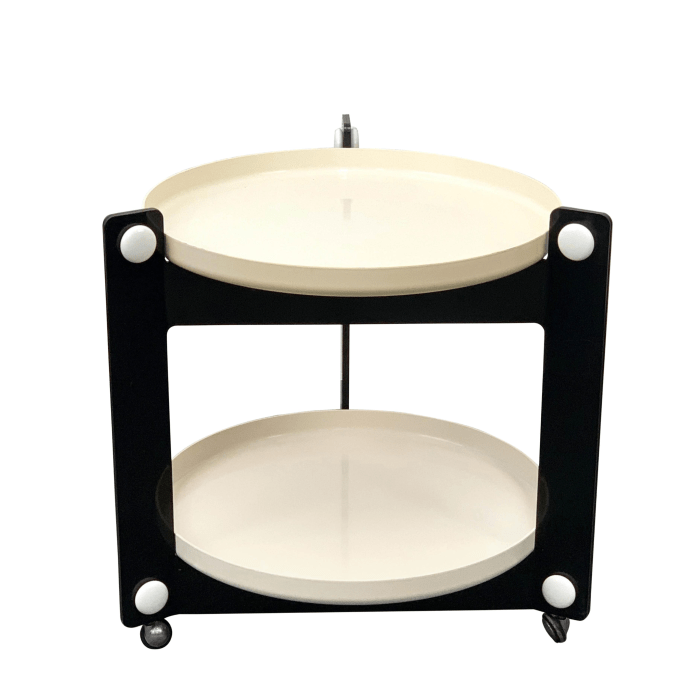 Questo carrello per bevande italiano degli anni ’70 è stato progettato da Luigi Massoni per Guzzini. Il carrello ha due vassoi, realizzati in plastica bianca. Questi due ripiani circolari rimovibili hanno un diametro di 56 centimetri e si trovano all’interno della struttura triangolare nera completamente […]