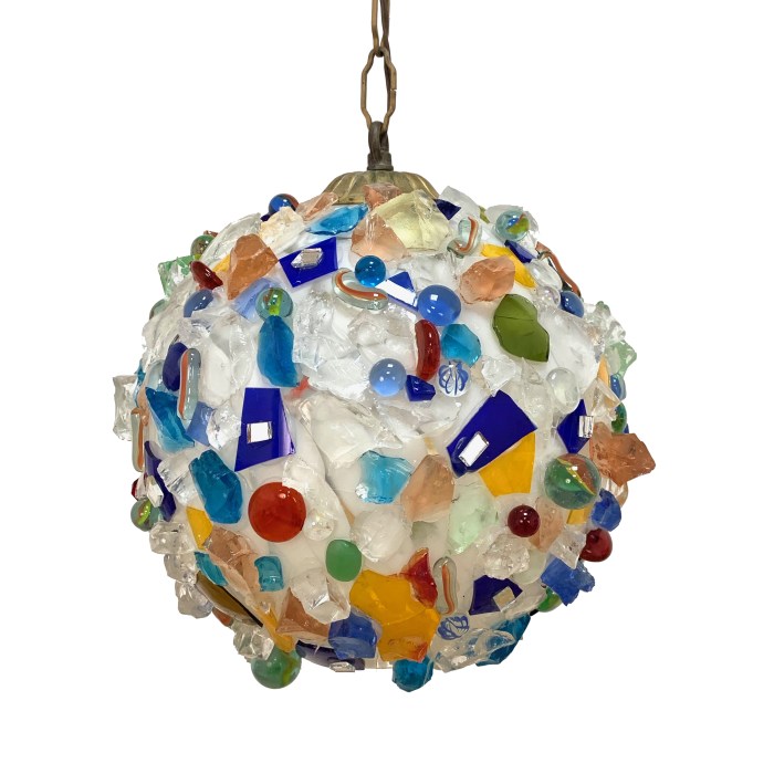 Splendido ed unico lampadario a sfera Arlecchino. Realizzato con una palla di vetro di Murano e schegge e pezzi di vetro. Bellissimo effetto sia quando è acceso, sia quando è spento. DIMENSIONI H 34,65 in. X Dm 11,82 in. H 88 cm x Dm 30 […]