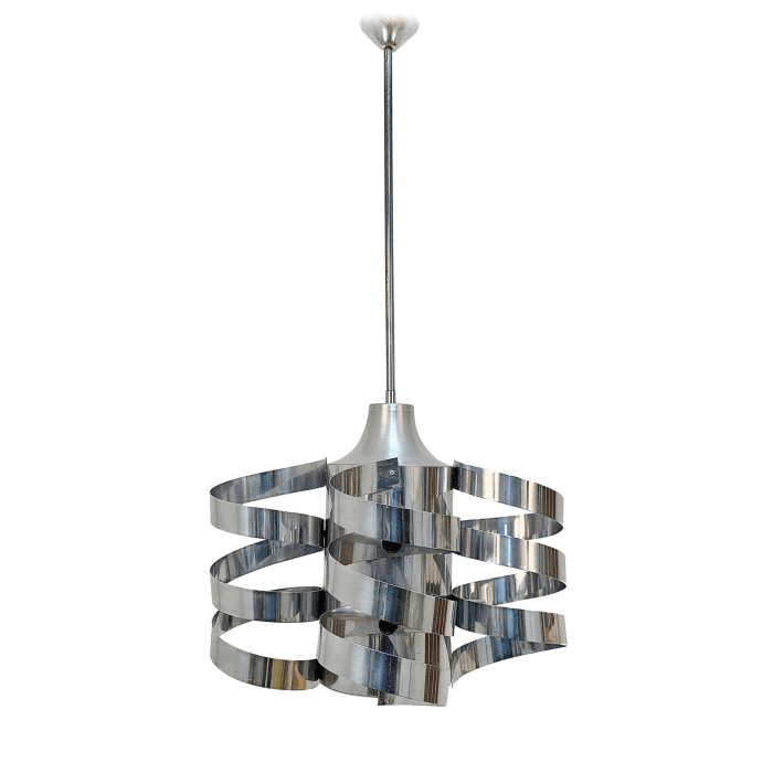 Max Sauze per Sciolari, Lampadario Cyclone, acciaio cromato e alluminio.