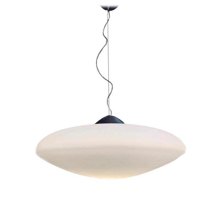 Grande lampada a sospensione in vetro opalino e acciaio. Firmata De Majo Venezia, anni ’70. Misura: diametro 23,62 in. – 60 cm