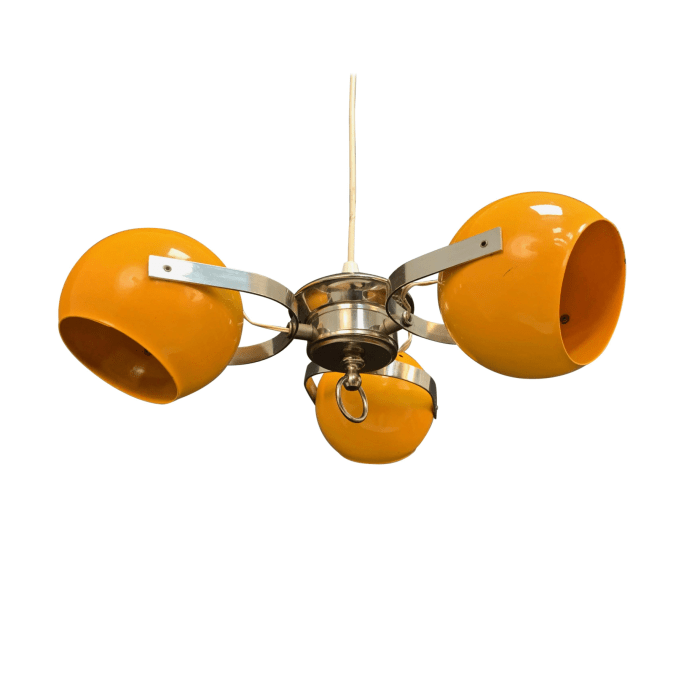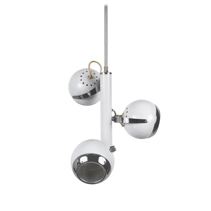 Lampadario a tre luci Space Age smaltato e cromato. Lampadario con tre sfere regolabili. Misure: diametro 40 cm, altezza 70. Sfere da 12 cm di diametro.