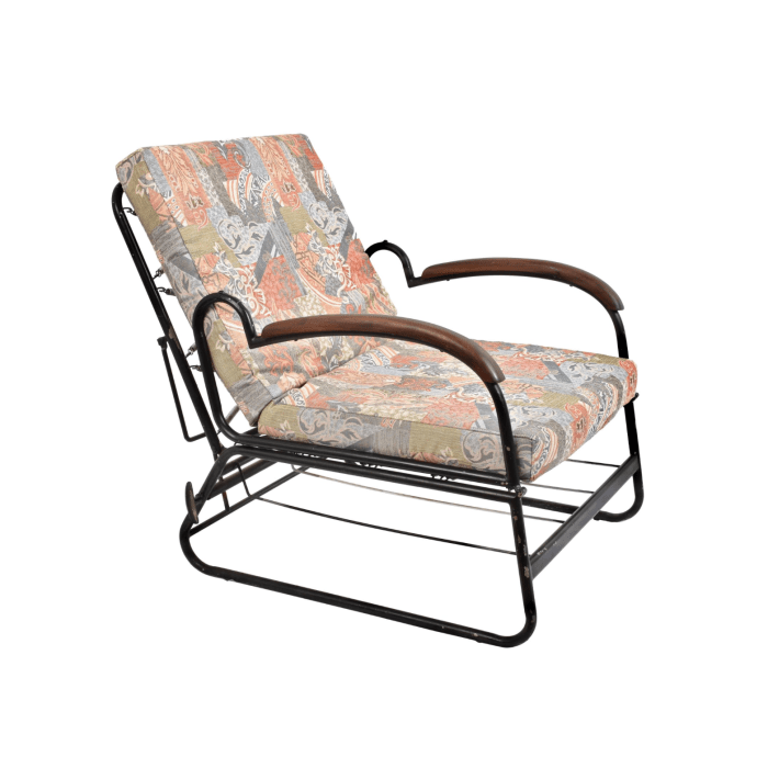Poltrona da letto regolabile in metallo curvato con braccioli in legno. Può essere usato come una poltrona o un letto. Pubblicato in passato, Antiquariato e modernismo di Elisabetta Barborini Ferrari e Augusto Bulgarelli a p. 240.