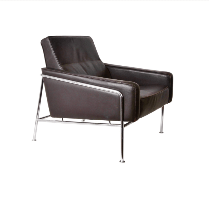 Poltrona in pelle di colore marrone scuro anno 1955 circa. Stato Molto buono – l’oggetto vintage può mostrare lievi tracce di usura Misure: Larghezza 73 cm – Profondità 79 cm – Altezza 72 cm