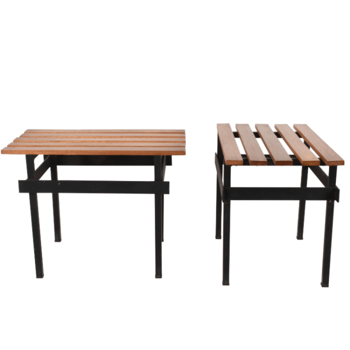 Set di due panche in legno di teak. La solida base in ferro smaltato. Eccellenti oggetti di design degli anni ’60. DIMENSIONI: H 42 cm x L 56 cm x P 33 cm