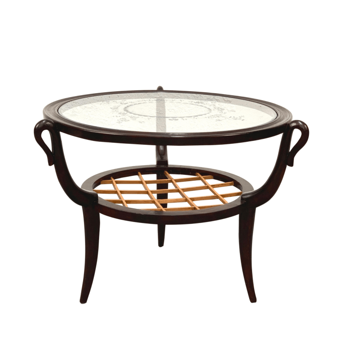 Tavolino a due livelli in legno e vetro inciso attribuito a Gio Ponti e prodotto in Italia negli anni ’50. È costituito da un piano circolare in legno scanalato che sostiene il piano in vetro smerigliato con motivi floreali. Il secondo ripiano è costituito da […]