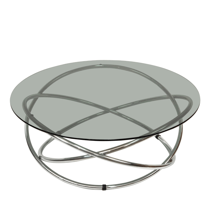 Bellissimo tavolino rotondo in acciaio cromato con piano in vetro fumé realizzato in Italia negli anni ’60. Questo tavolino italiano in stile atomico presenta una base con tre anelli tubolari in metallo e un piano in vetro fumé. Un esempio perfetto del design degli anni […]