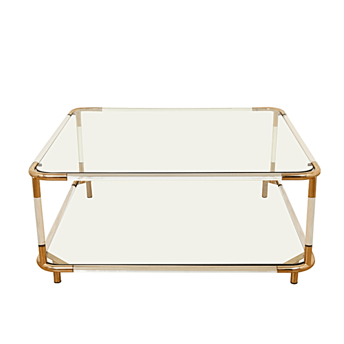 Tavolo da salotto in Lucite e ottone dorato. Dimensioni: 100x100x40 cm