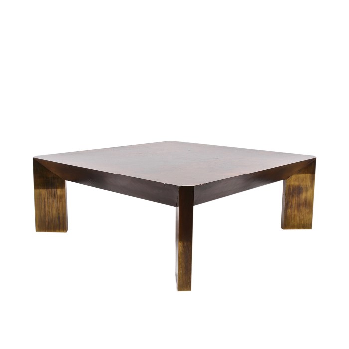 Bellissimo tavolino da salotto rivestito in radica di noce. Le gambe sono rivestite con lastre di ottone Misure: cm 80×80 altezza 30
