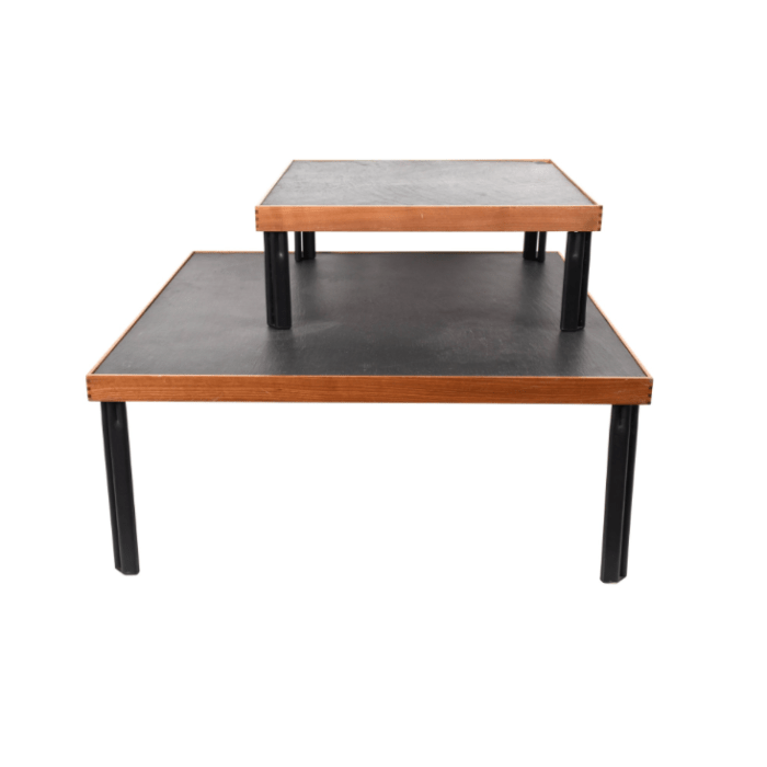 Naviglio. Designed by Piero De Martini for Cassina, Italy. 1980’s. Walnut, slate and lacquered metal. Large table measures: 85 x 85 x cm 35 H Small table measures: 57 x 57 x cm 22 H