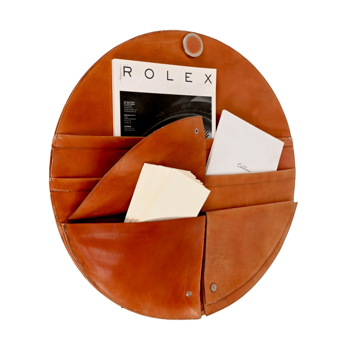 Incredibile portariviste da parete tondo in pelle e acciaio della metà del secolo. Questo pezzo sorprendente è stato prodotto da Frau in Italia negli anni ’70. Dimensions: Diameter: 23.63 in. (60 cm)