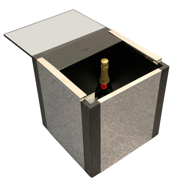 Bar a forma di cubo, stile Willy Rizzo, acciaio specchiato, vetro, Italia, anni ’70