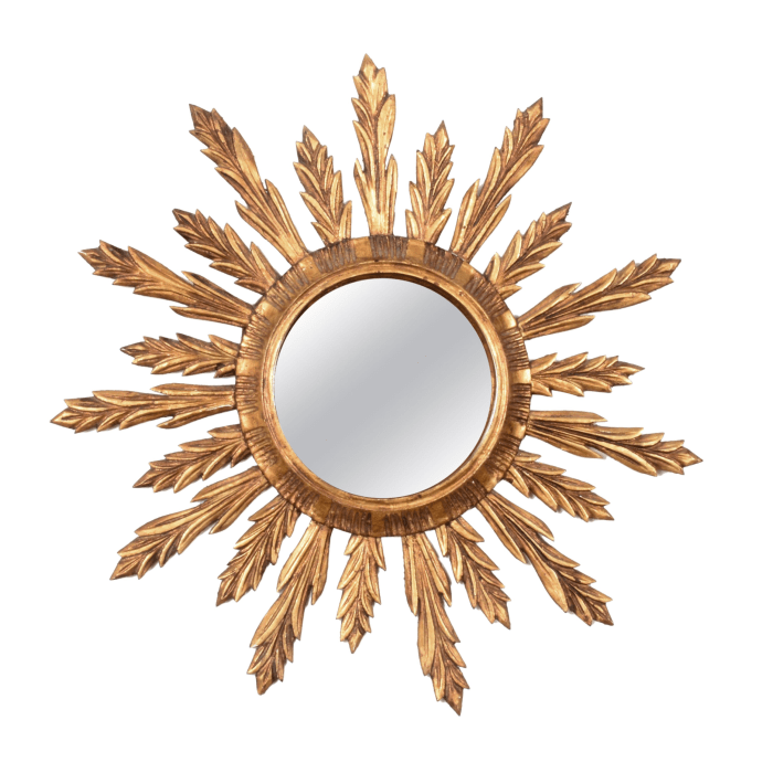Specchio da parete in legno dorato, vintage Giltwood Sunburst, Francia anni ’50, portafortuna