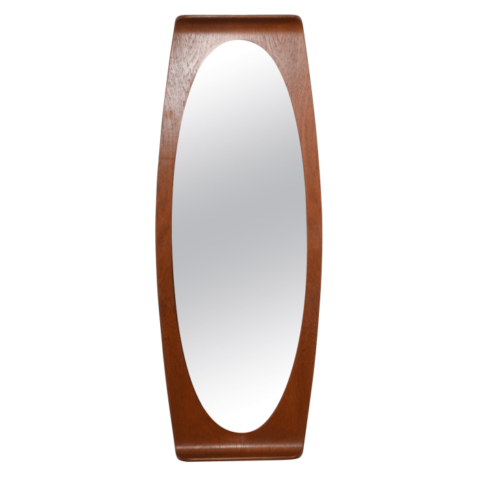 Specchio ovale anni ’60, struttura in teak. Misure: Cornice 35 x 105 cm Specchio 24 x 100 cm Vintage, segni di uso del tempo.