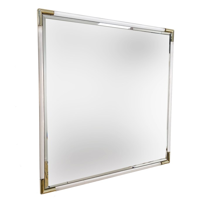 Specchio da parete quadrato con cornice in plexiglass, angoli dorati, firmato, Italia, anni ’70