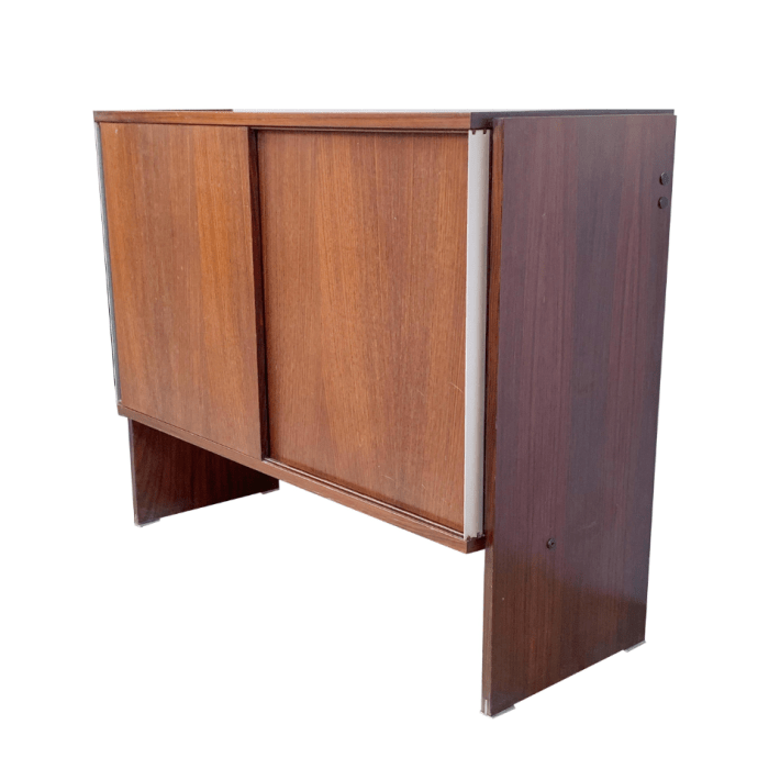 Credenza in palissandro con ante scorrevoli, disegnata da Ico Parisi per MIM Roma. Rifiniture in alluminio. Poggia su quattro basi in alluminio. Etichetta all’interno Misure: H 81 cm x L 99 cm x P 40 cm
