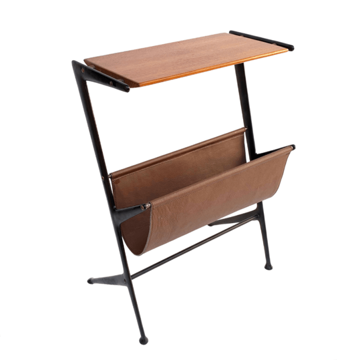 Meraviglioso e raro tavolino. Attribuibile a Ico Parisi, un tavolino portariviste italiano degli anni ’50. Struttura in metallo smaltato, piano in legno sagomato, portariviste in pelle. Completamente smontabile. Misure: H 60 cm x L 43 cm x P 26 cm
