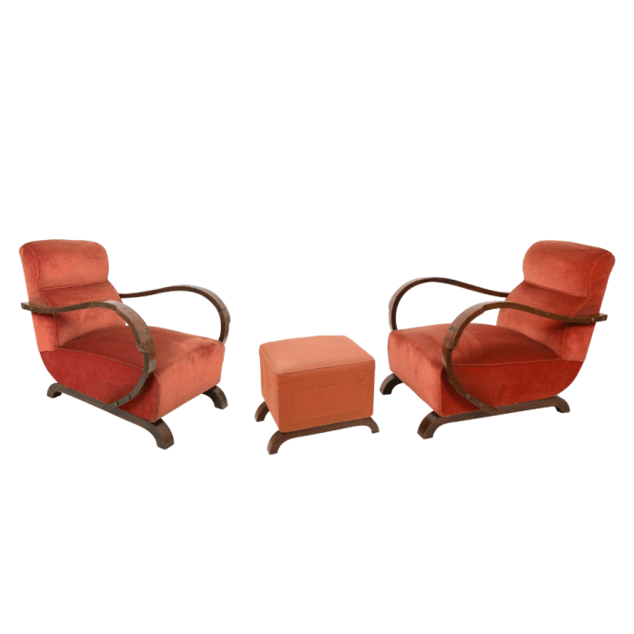 Coppia di poltrone e un pouf in stile Art Déco. Legno e tessuto Italia anni ’30 Il tessuto del poggiapiedi è diverso da quello delle poltrone.